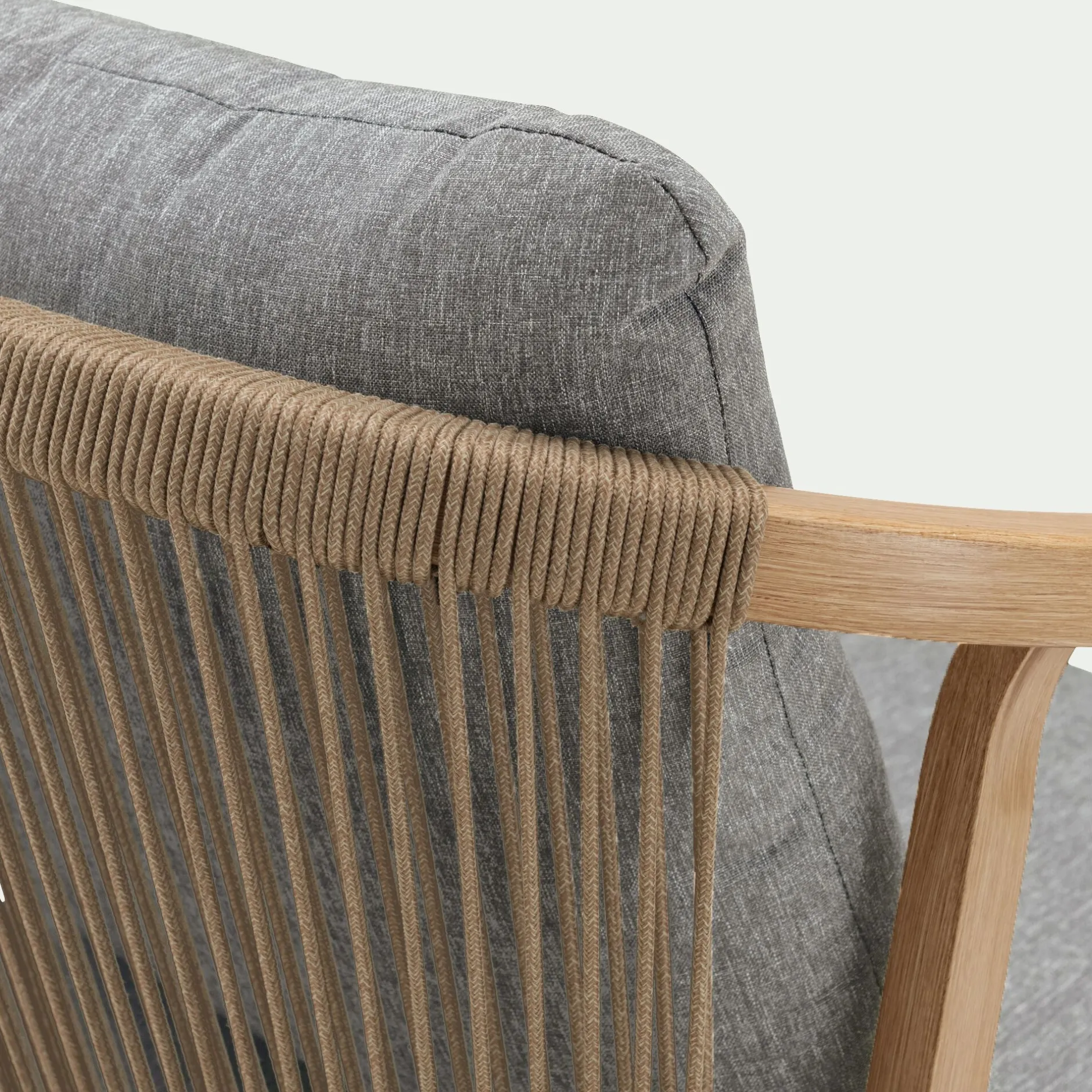 La chaise de jardin Myrthe allie modernité et confort. Sa structure en aluminium effet bois combine les avantages d’un matériau résistant et facile d’entretien avec l’élégance du bois naturel. Son dossier en cordage ajoute une touche d’originalité et de confort, tandis que les deux coussins en tissu gris offrent une assise agréable pour des moments de détente prolongés. Une chaise à la fois pratique et esthétique, idéale pour sublimer votre espace extérieur.