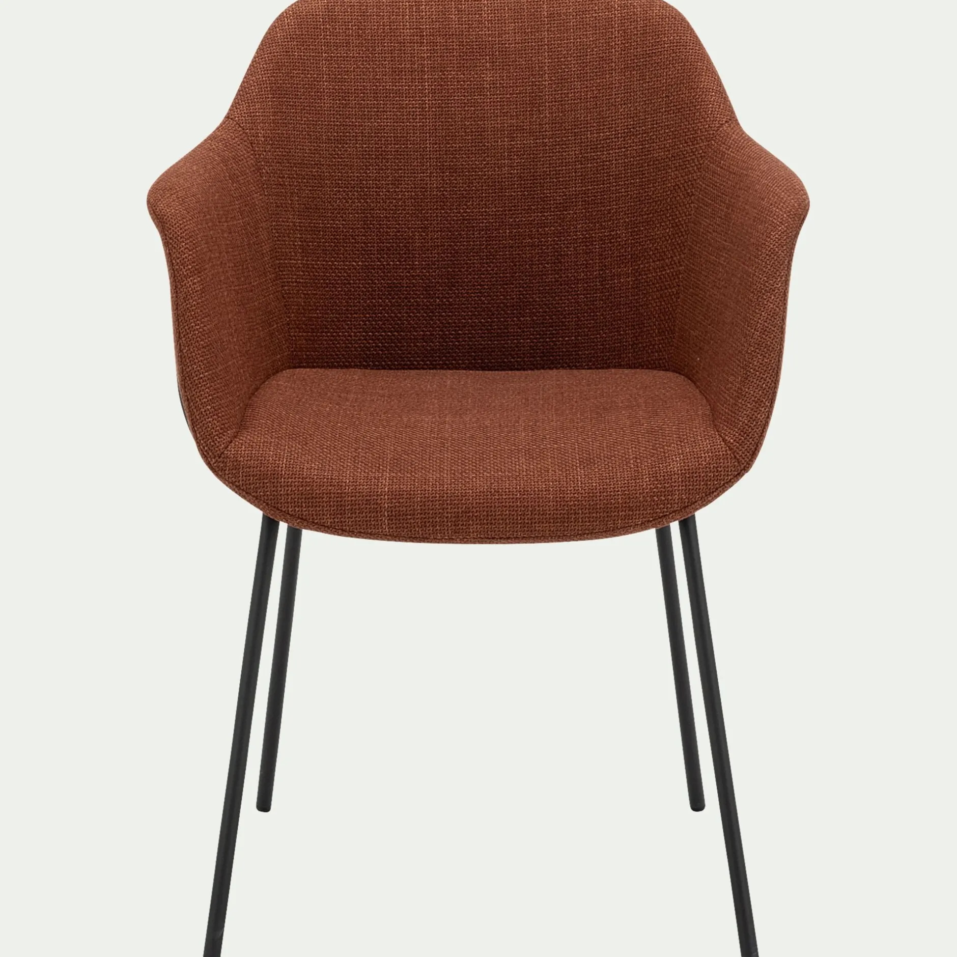 Chaleureux et profond, le coloris brun rustrel donne du caractère à la chaise Chloe. Cette nuance raffinée s’accorde parfaitement à une déco aux tons terreux ou naturels. Grâce à son tissu, ses accoudoirs intégrés et son piètement noir minimaliste, cette chaise de repas devient un vrai atout confort dans la salle à manger.