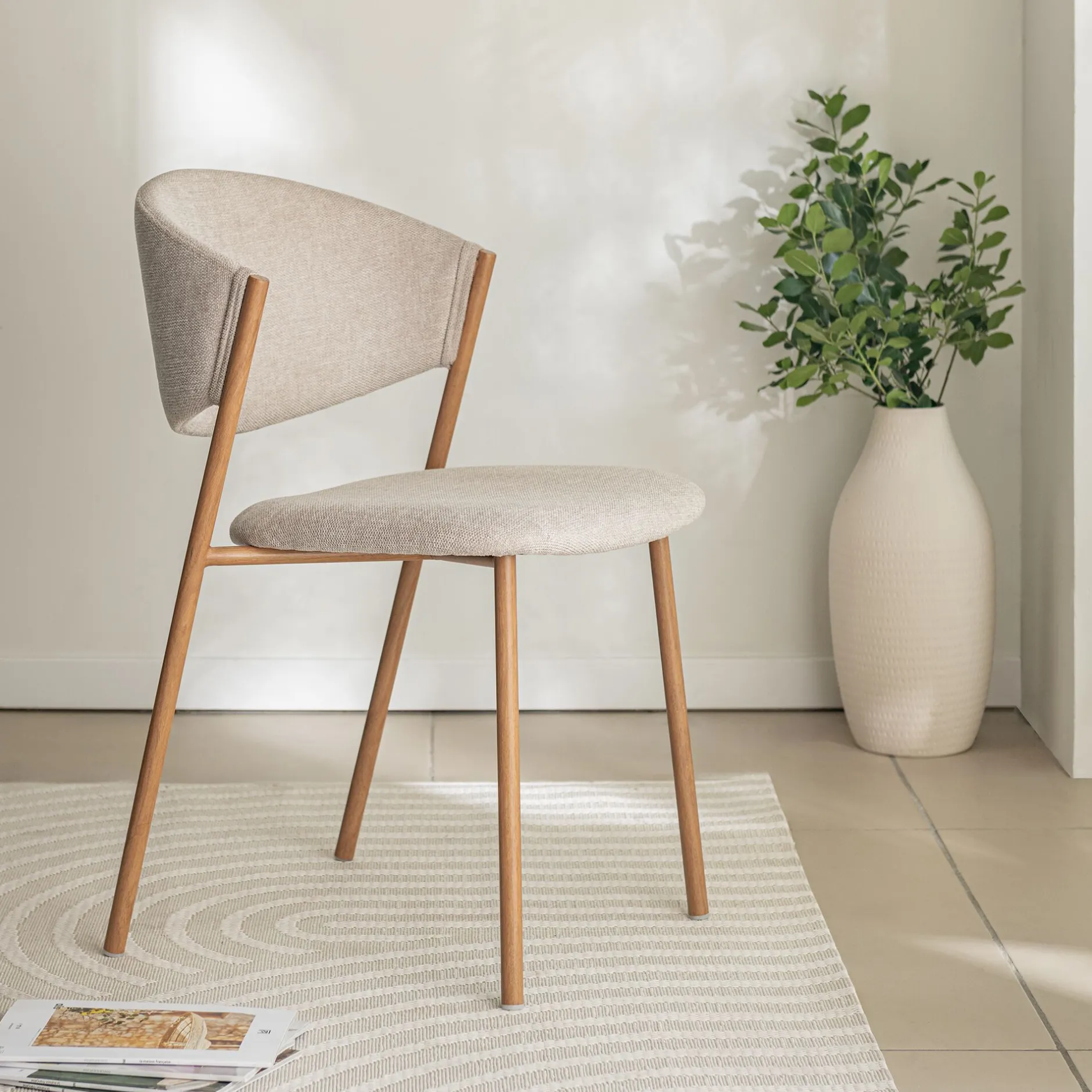 La chaise de repas Cassandre séduit par son allure aérienne et son confort enveloppant. Son piètement en métal effet bois allie finesse et légèreté visuelle, tout en assurant une excellente stabilité. L’assise en tissu Oeko-Tex beige apporte douceur et clarté à la pièce, créant une ambiance chaleureuse et lumineuse. Son dossier incurvé épouse parfaitement le dos pour un confort optimal lors des repas. Une chaise à la fois discrète, élégante et accueillante.