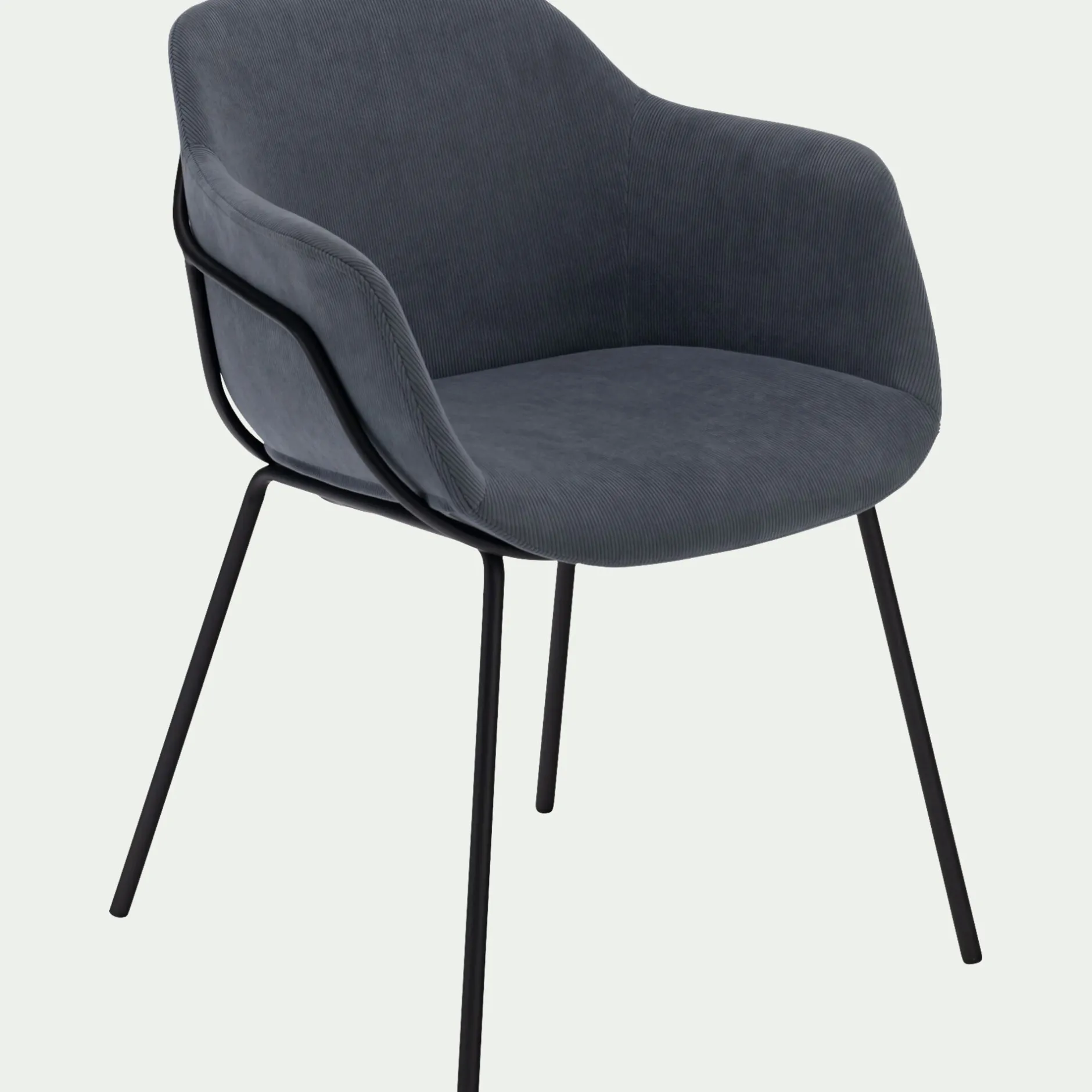 Cette chaise de salle à manger se distingue par son design soigné et moderne. Elle est dotée d’une structure en acier noir et d’une assise confortable en mousse, recouverte de velours côtelé pour un toucher doux. Ce modèle, avec accoudoirs, allie confort et style, apportant une dimension décorative supplémentaire à votre pièce de vie. Proposée en coloris bleu, cette teinte profonde et intemporelle apporte une touche de fraîcheur tout en s’intégrant harmonieusement à la décoration de votre intérieur.