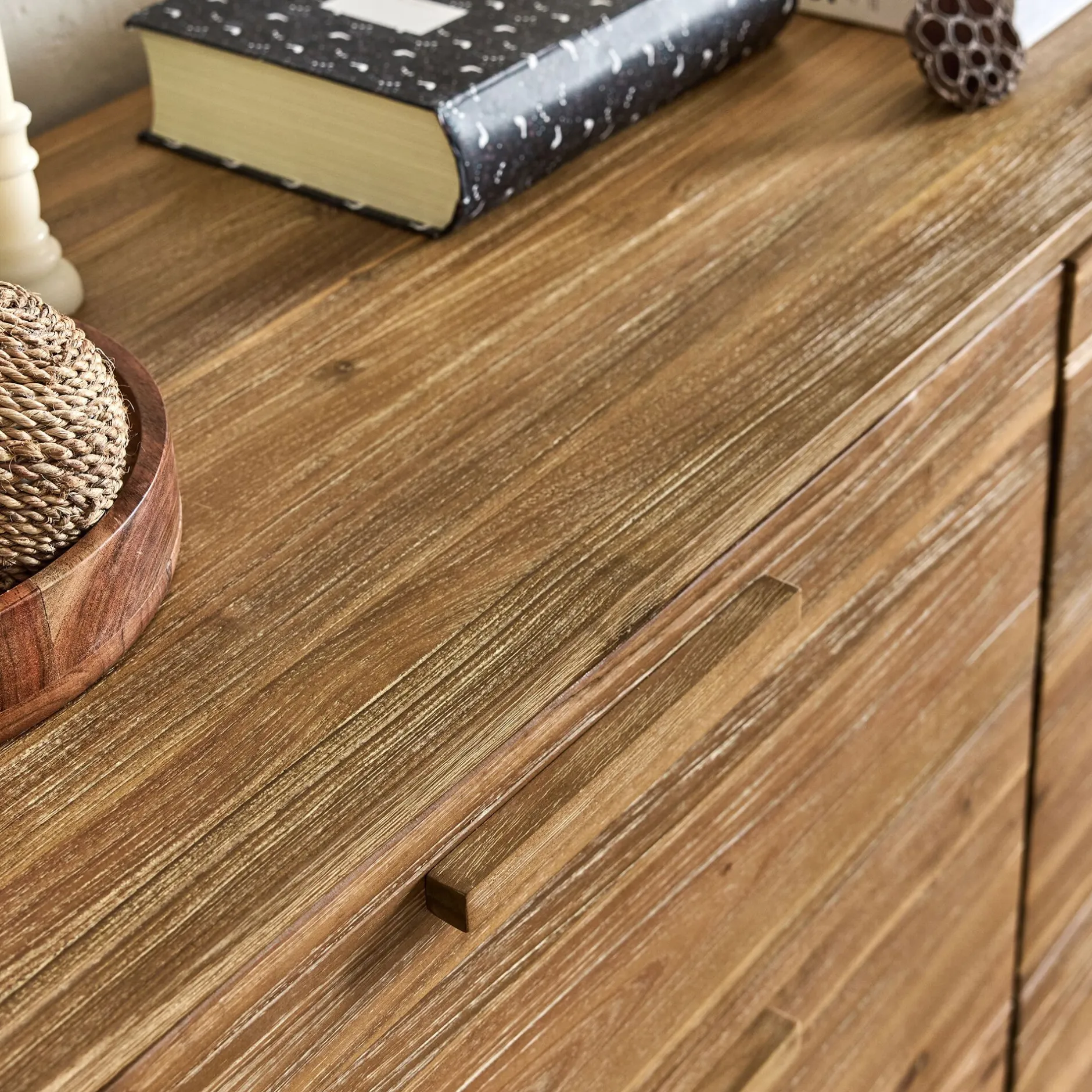 Tiroirs en acacia et contreplaqué.