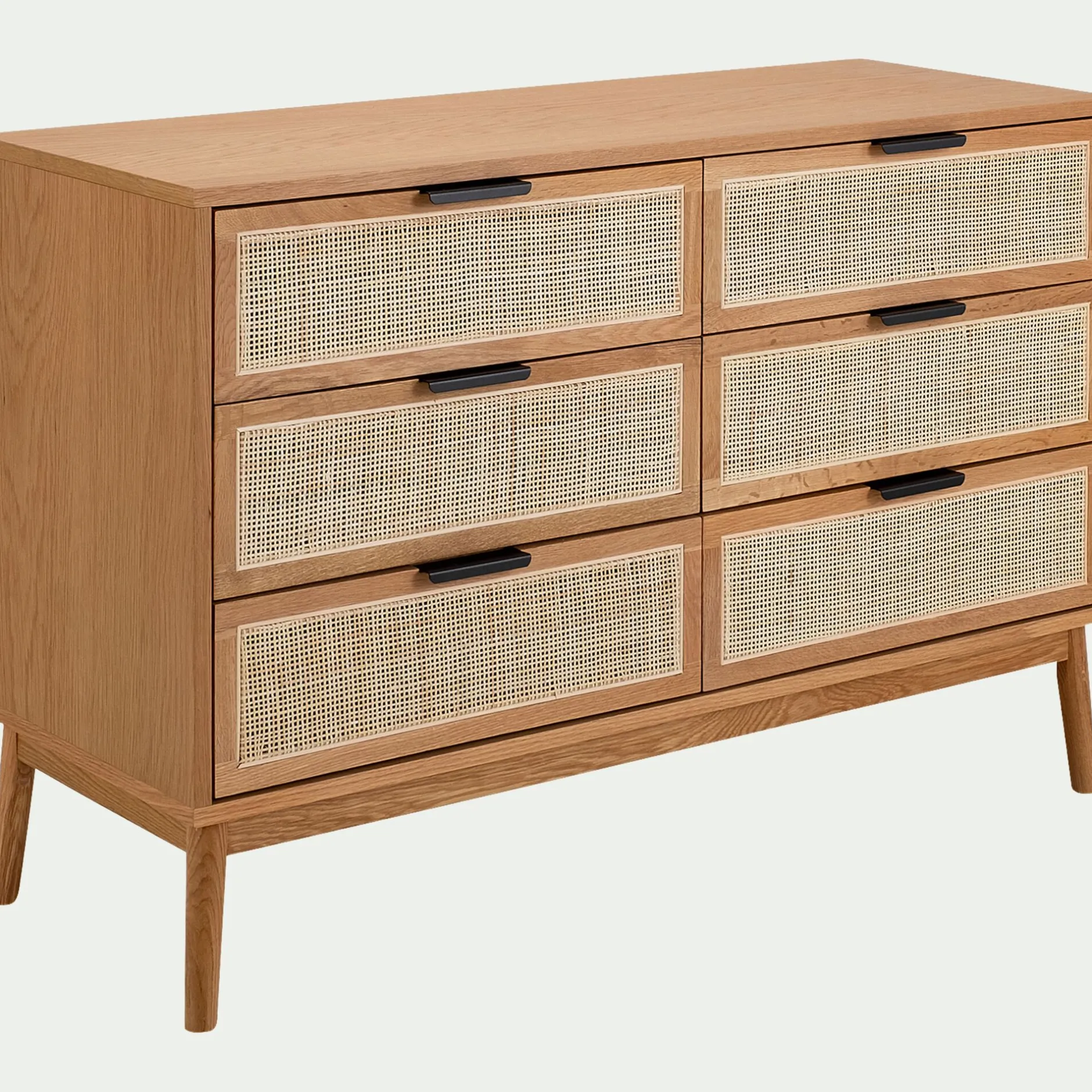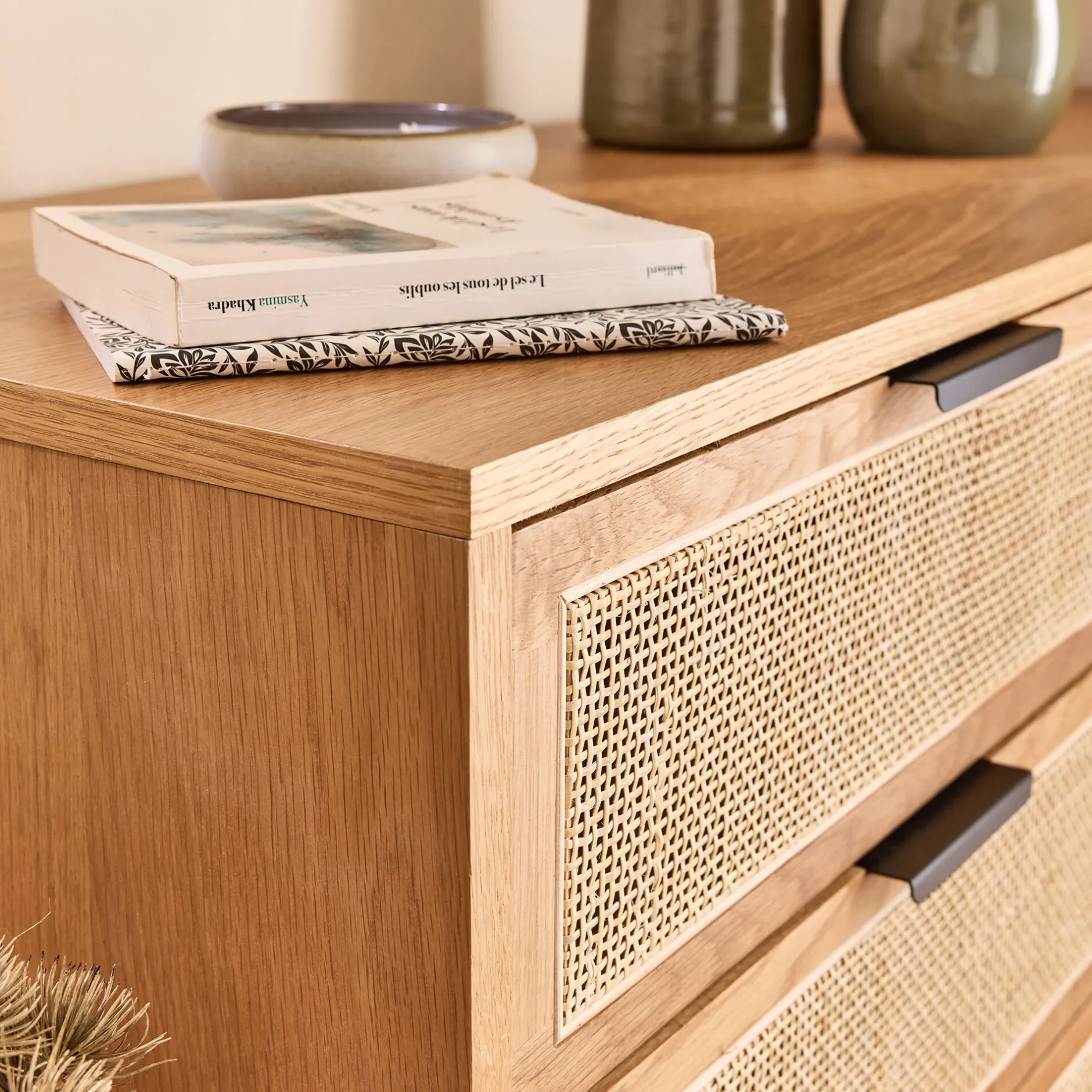 Chêne et MDF chêne plaqué, façade des tiroirs en canne naturelle.