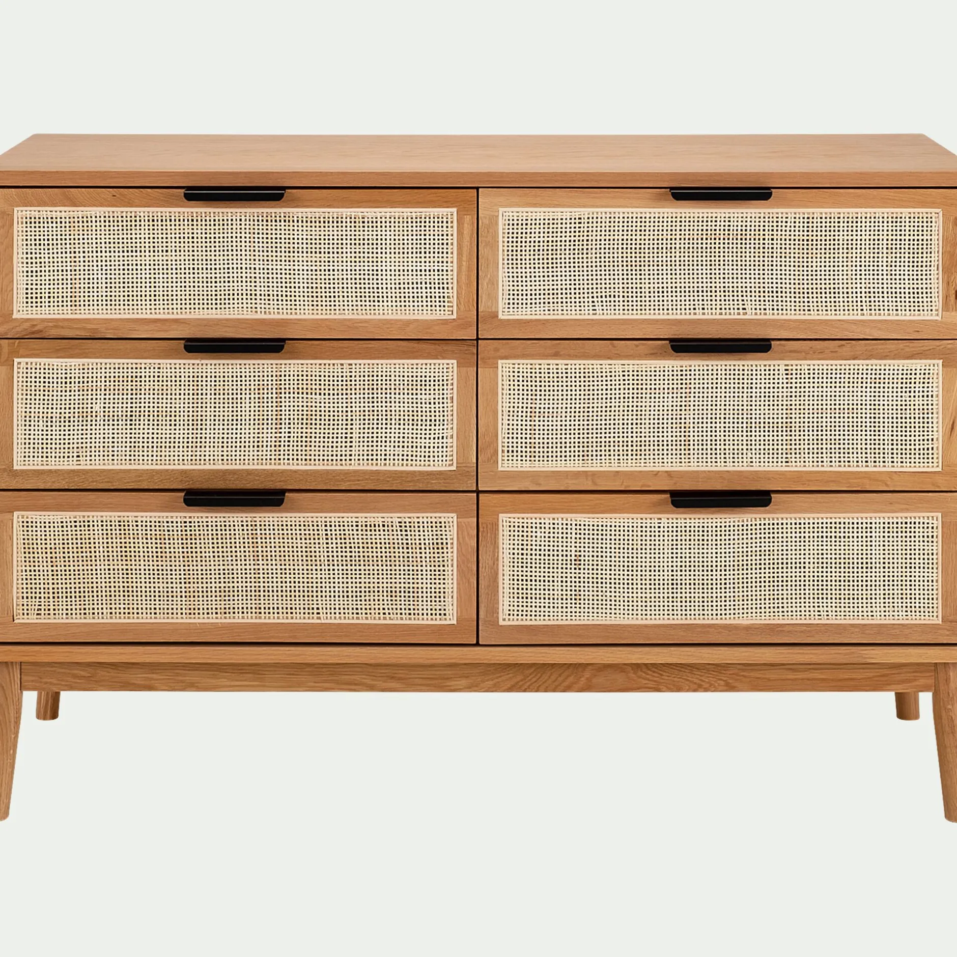 La commode est le mobilier idéal pour optimiser votre intérieur et créer un espace de rangement supplémentaire. Le modèle Callista propose 6 grands tiroirs, parfaits pour ranger vos affaires. Cette commode en bois présente un design intemporel et un coloris naturel, ainsi qu’une finition en cannage, ce qui en fait un véritable atout déco. Cette commode saura trouver sa place dans votre chambre à coucher.