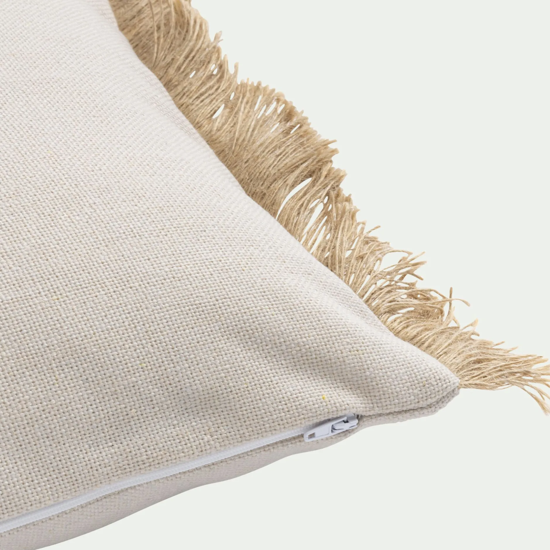 Découvrez ce joli coussin d’extérieur. Tissé en majorité à partir de matière synthétique, ce coussin rectangulaire est très résistant. Le coton et la viscose viennent lui donner de la douceur pour des moments confortables sur votre terrasse ou votre balcon. Dans un jardin, ce coussin déco est parfaitement protégé contre l’humidité. Ce coussin de 30×50 cm, avec sa finition franges en jute, décore votre salon de jardin et lui donne une touche de charme supplémentaire. Il est disponible en divers coloris.