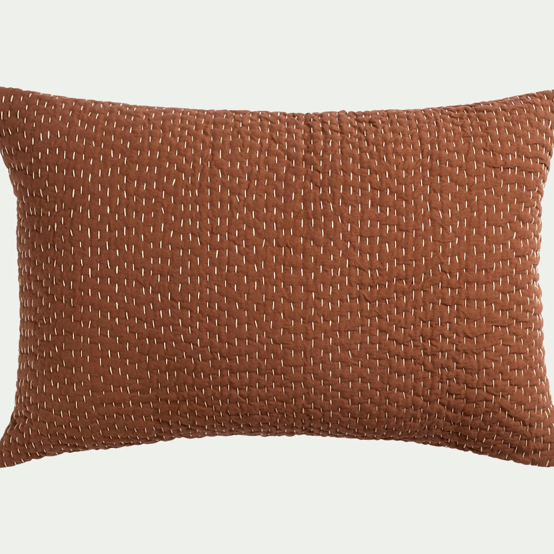 Ce coussin rectangulaire (40×60 cm) habille canapé ou lit d’une touche chaleureuse. Sa housse en lin et coton mêle matières naturelles et confort, sublimée par un coloris brun rustrel profond. Une surpiqûre blanche, réalisée à la main selon la technique traditionnelle Kantha, habille tout un côté du coussin, apportant contraste et relief. Déhoussable par zip, il allie esthétique et praticité pour une déco raffinée et facile à vivre.