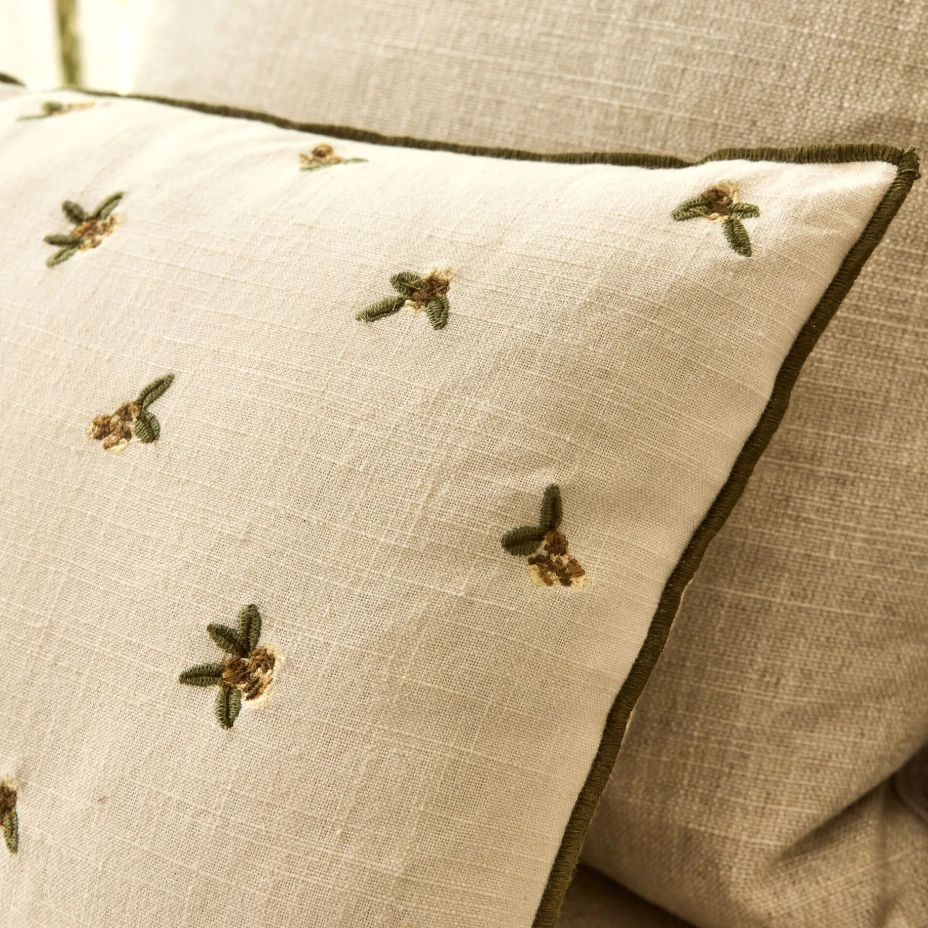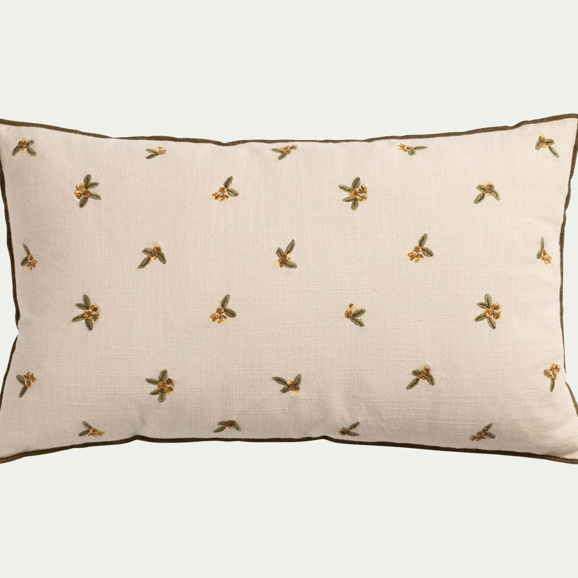 Ce coussin rectangulaire (30×50 cm) apporte une touche fraîche et joyeuse à la déco du canapé. Confectionné en coton naturel, il est orné de petites fleurs jaunes brodées qui évoquent les champs ensoleillés. Un passepoil vert souligne ses contours et ajoute un joli liseré, à la fois discret et plein de caractère. Une alliance de douceur et de nature pour une atmosphère lumineuse et apaisante dans le salon.