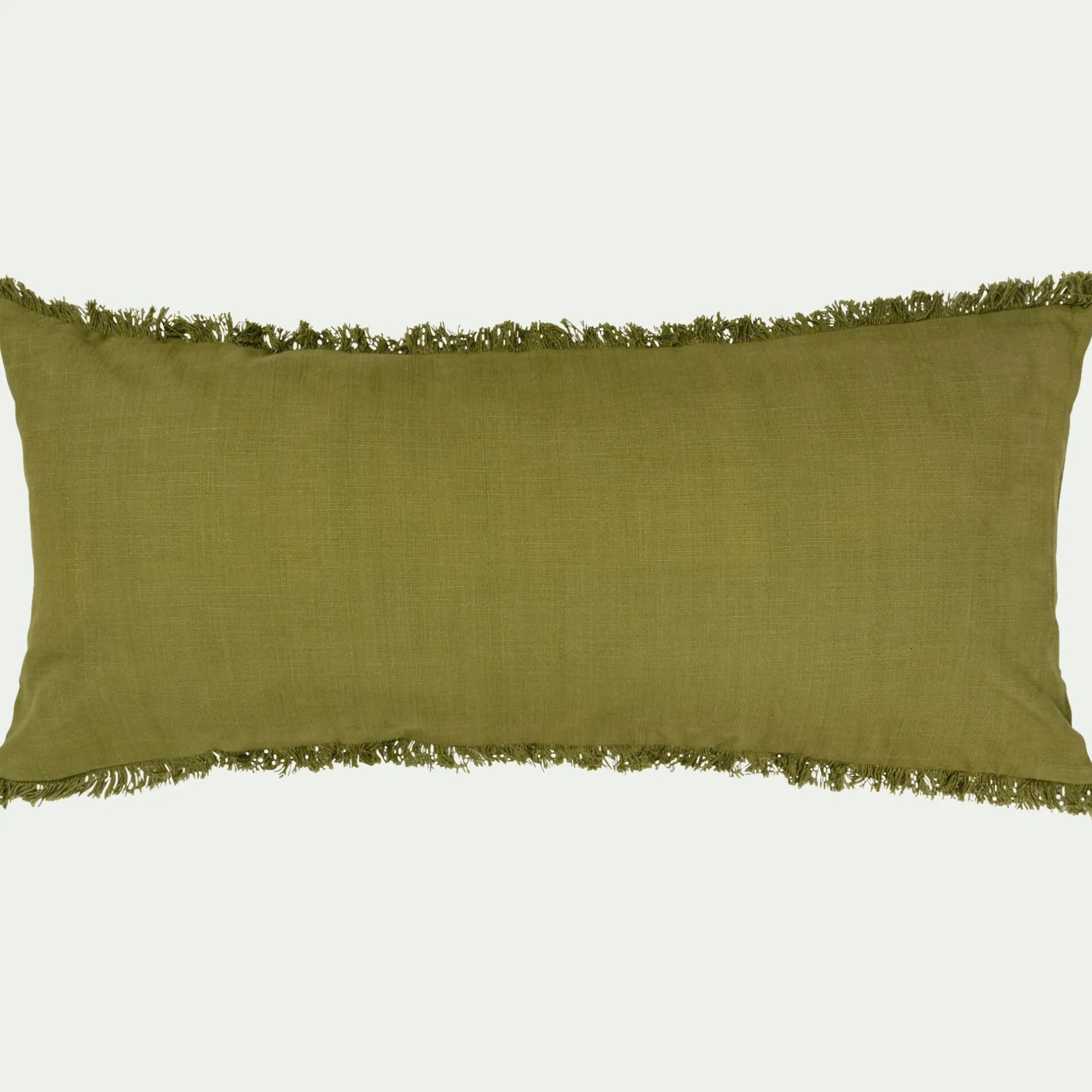 Apportez une touche de couleur à votre décoration avec ce grand coussin rectangulaire de 40×90 cm. Ce coussin déco nous séduit par ses formes généreuses et son vert profond. Cette nuance, appelée vert garrigue, participe à une atmosphère puissante et rassurante. Véritable anti-stress, le vert crée un sentiment de confort et de détente bienvenue dans le séjour. Ce coussin vert se compose d’une housse en coton et d’un garnissage moelleux. De courtes franges viennent souligner ses courbes et lui apporter fraîcheur et vitalité.