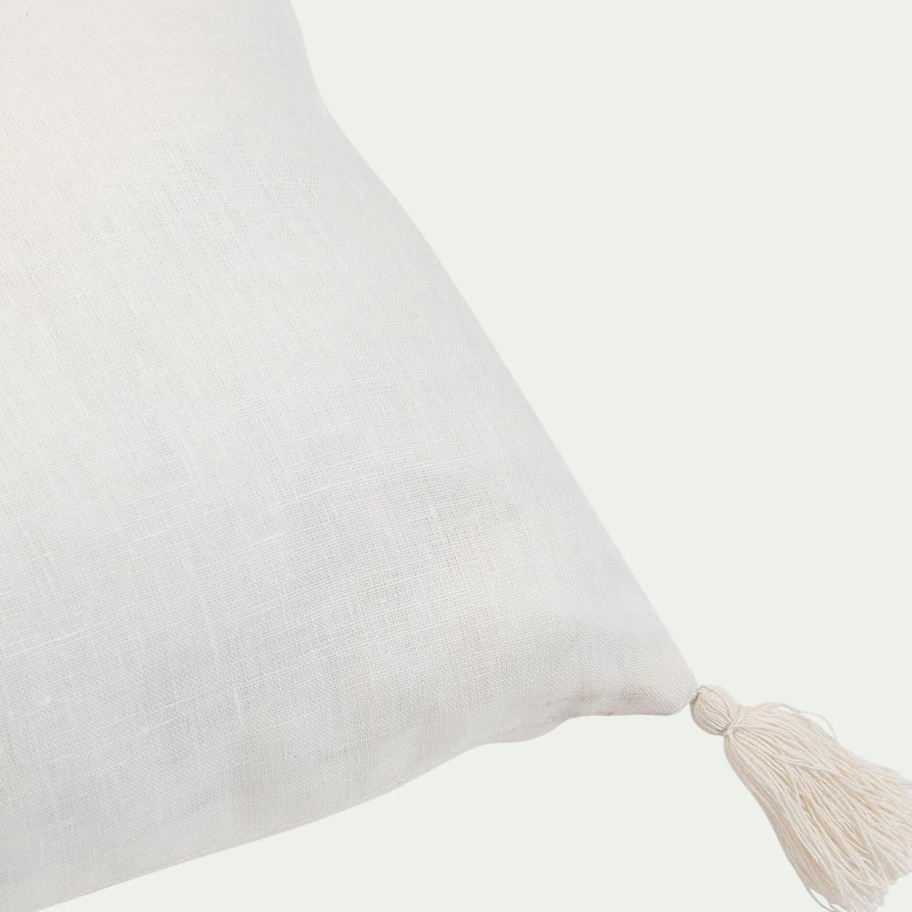 Ce joli coussin rectangulaire est doté d’une belle housse blanc ventoux en lin. Avec ses finitons en pompons aux extrmistés, il ajoute une touche décorative à votre intérieur. Disposé sur un canapé gris ou un canapé en cuir marron par exemple, ce coussin déco, en 30x80cm