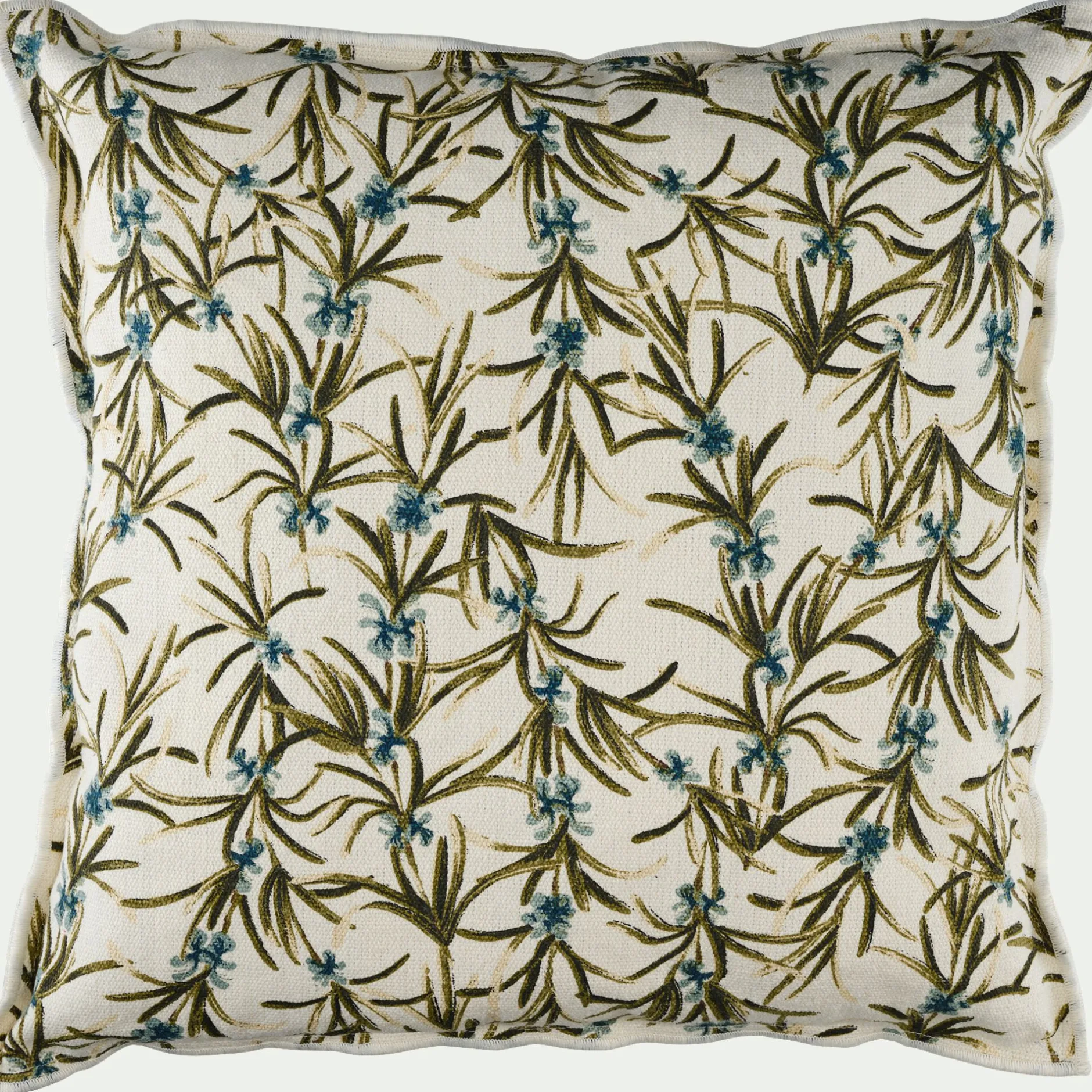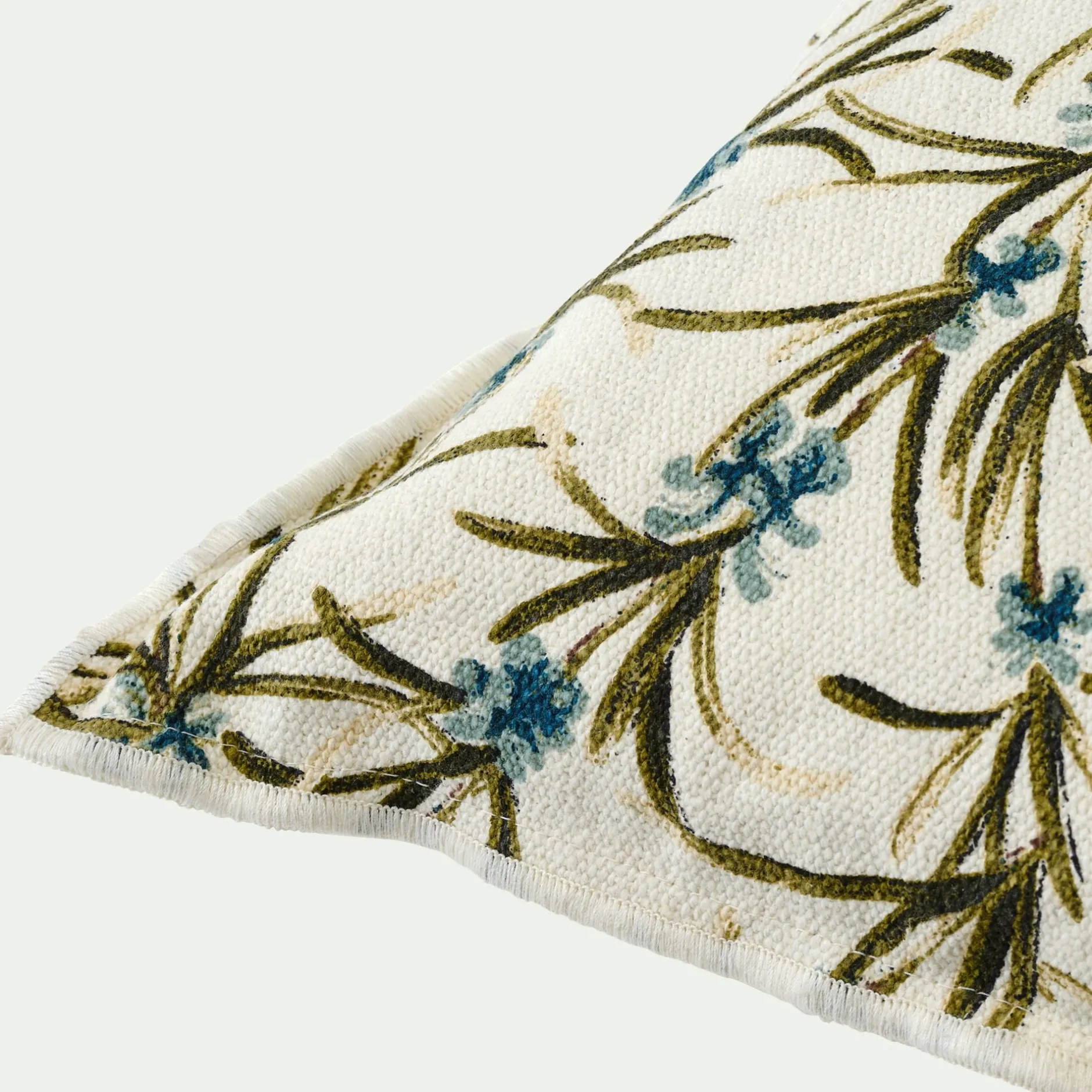 Le coussin Romarin porte le nom d’une plante originaire du bassin méditerranéen. Il tient son nom de son motif réaliste : sur la toile en coton, de fines tiges de romarin tournoient dans un balai vivifiant. Ce motif floral apporte une touche de fraîcheur à ce coussin déco et à l’ensemble de la pièce. Les feuilles vertes accompagnent de petites fleurs bleues, motif délicat et poétique qui inspire la douceur de vivre. Ce coussin en coton présente également une finition en point de bourdon, une broderie élégante qui souligne le contour.