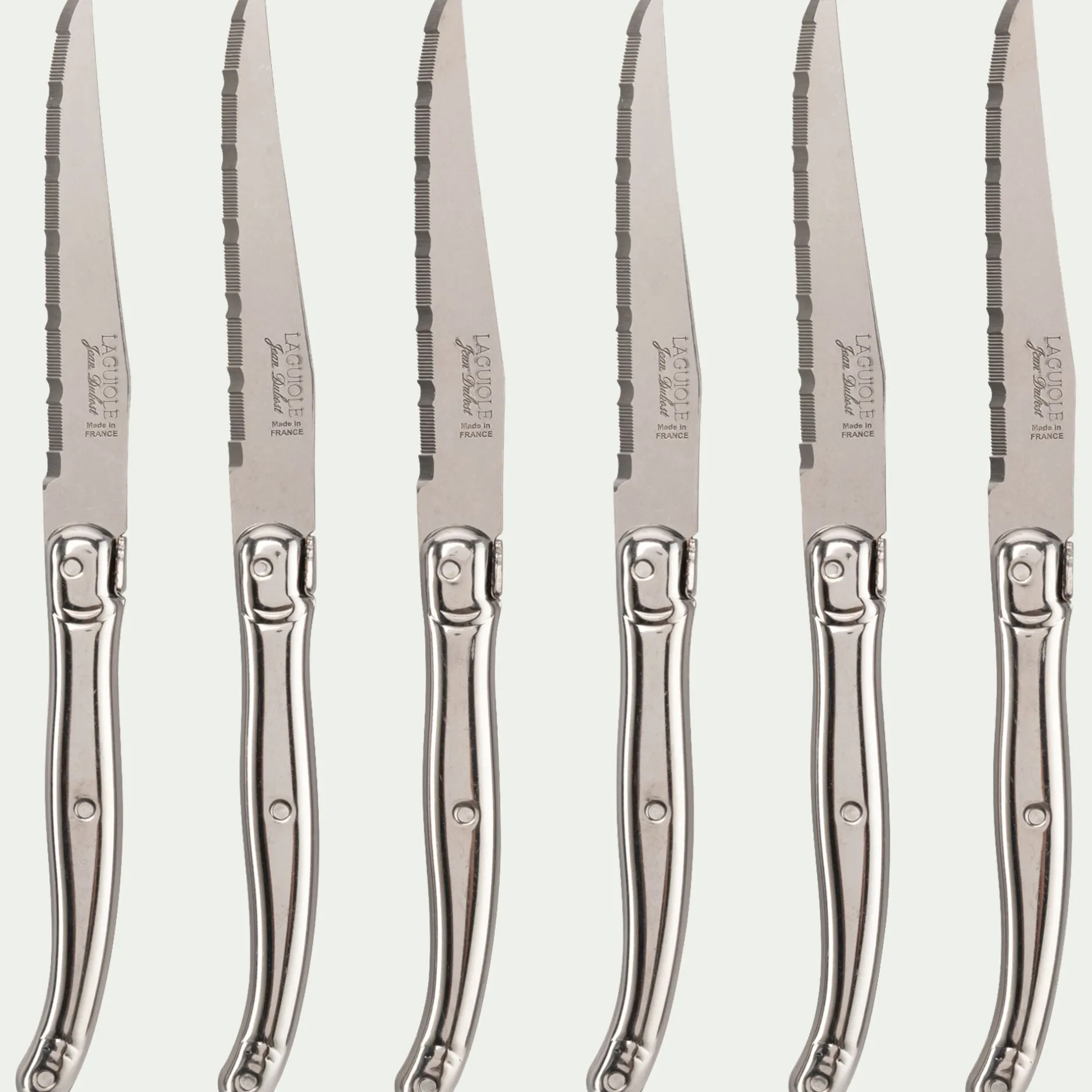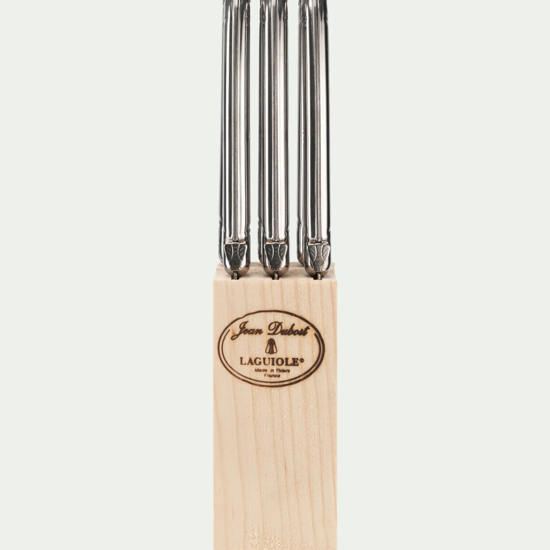 Complétez vos ustensiles de cuisine avec ces élégants couteaux en inox. Leur lame est parfaite pour couper les viandes sans effort et savourer tous vos plats. Ce bloc de 6 couteaux trouvera aisément sa place dans votre cuisine. Ces couteaux à steak sont parfaits pour compléter votre dressage de table. De fabrication française, ses couteaux sont de très bonne qualité.