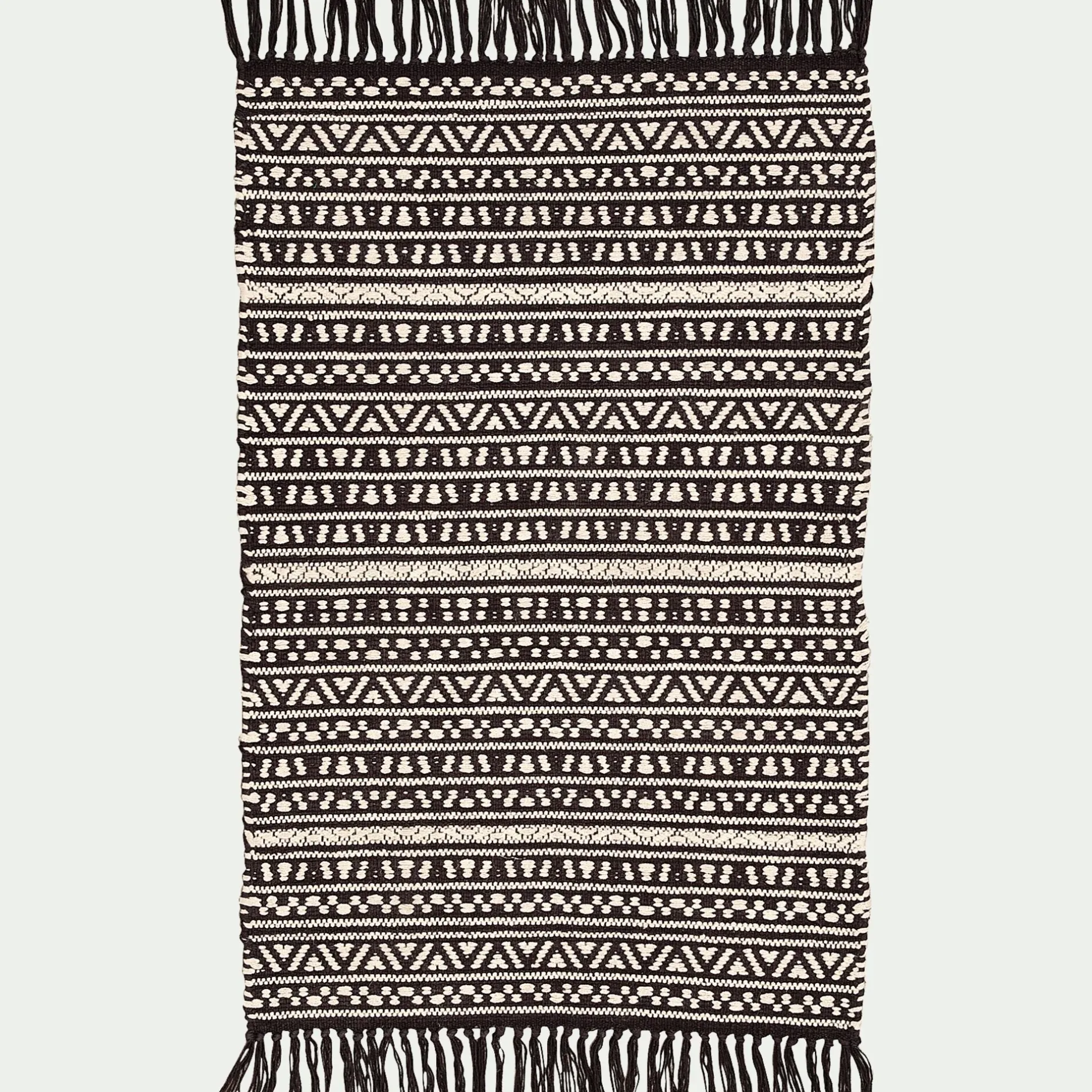 Ce petit tapis blanc aux motifs noirs offre un puissant contraste. Ces deux couleurs, neutres et sophistiquées, se marient à merveille dans des formes atypiques : ce tapis porte en lui l’élégance de l’intemporel mais aussi une certaine forme de décontraction. Ses motifs aztèques sont inspirés de la culture amédindienne. Lignes, zigzags et triangles sont tissés à partir de coton. Ce tapis souple arbore de belles franges qui valorisent la matière et confèrent au textile un esprit ethnique. 100% coton et de léger (600g), le tapis Ossa passe aisément en machine pour un entretien facilité. De petite taille (60x90cm), il convient particulièrement à une chambre à coucher, comme descente de lit graphique pour apporter une touche de vitalité et de modernité à votre pièce.