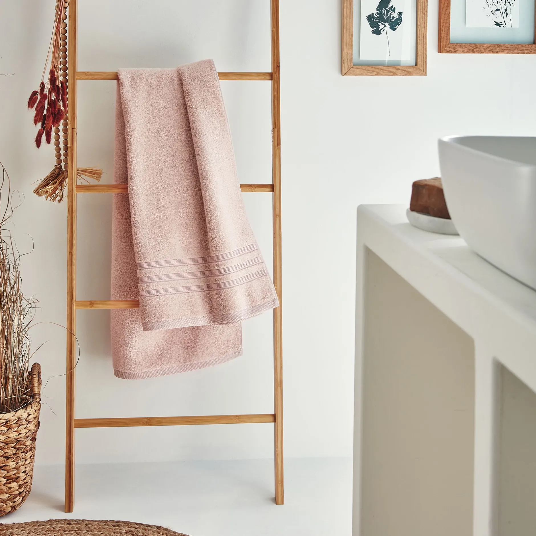 La salle de bains se transforme en un monde de douceur avec la gamme de linge de toilette Noun. Une bouclette en éponge « zéro torsion » résultant d’un tissage très rigoureux, le bien-être est à porté de main avec ce drap de douche. Son coloris rose grège apporte une note de charme à la salle de bains.