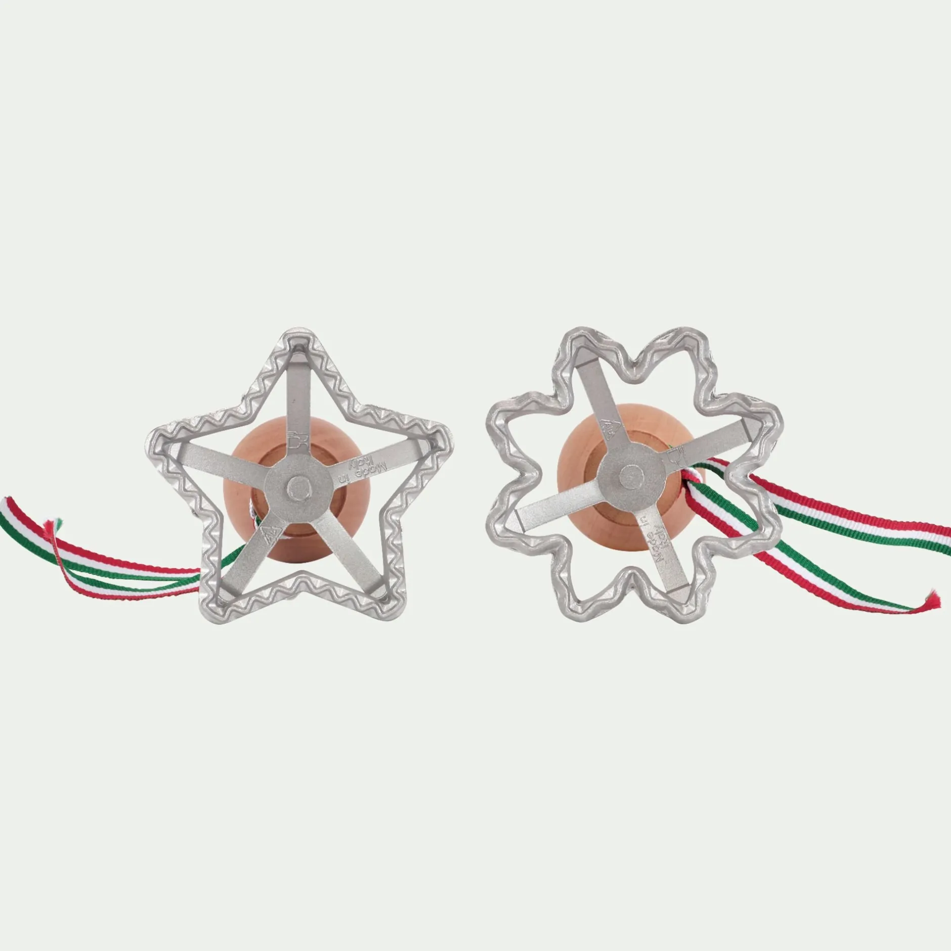 Grâce à ces deux tampons, créez des raviolis ou encore des biscuits parfaitement découpés. Pour ce faire, étalez votre pâte avec ou sans garniture. Attrapez le manche en bois et appliquez une pression sur votre préparation. En quelques secondes, de beaux biscuits ou raviolis se découpent, prêts pour la cuisson. En forme d’étoile ou de fleur, choisissez selon vos envies. Ces deux emporte-pièces fantaisistes sont le secret d’une préparation gourmande et réussie, parfaite pour épater vos invités.