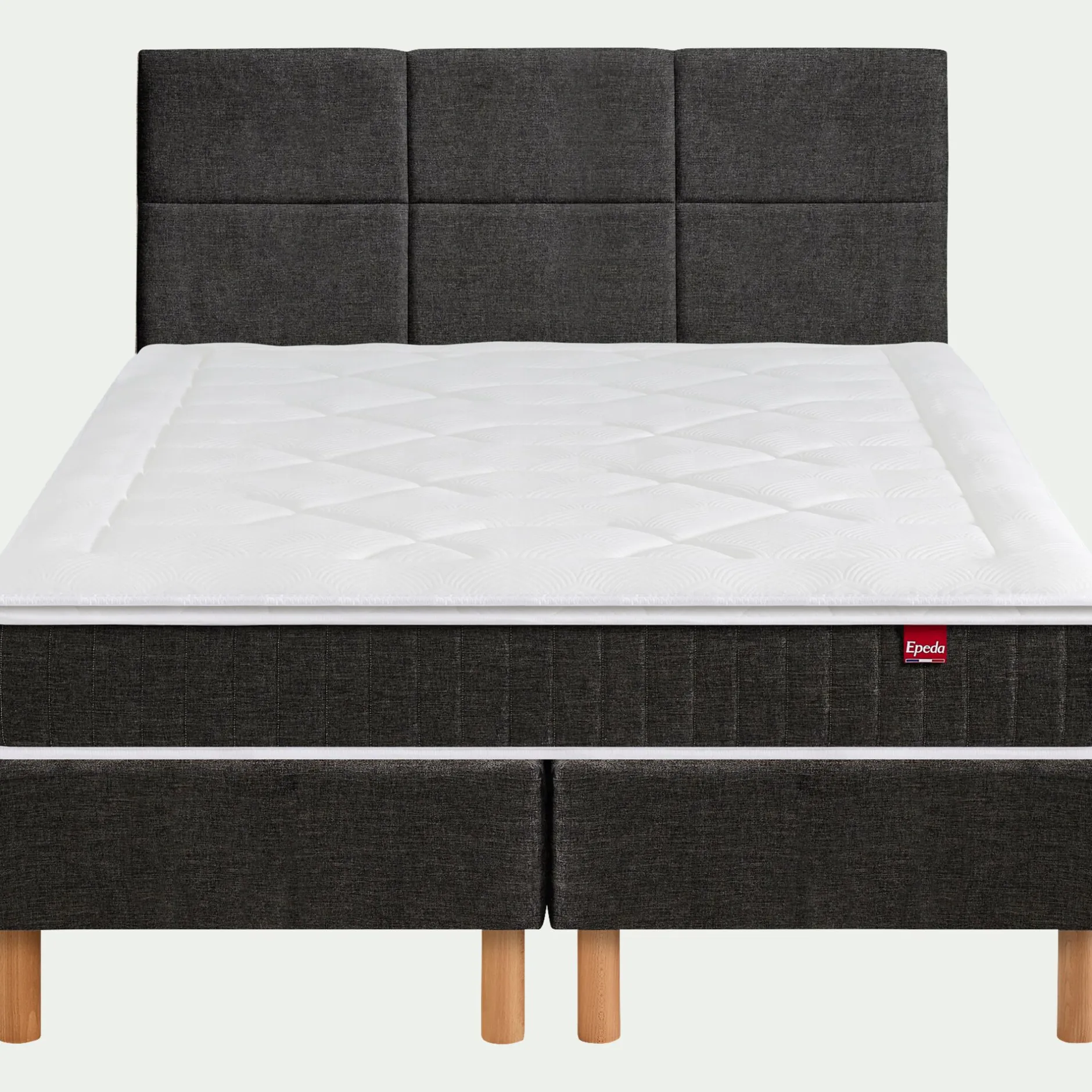 Sommier : ressorts biconiques (Bonnel) 24cm. Caisse en bois massif d’épicéa recouvert d’un tissu déco100% polyester.