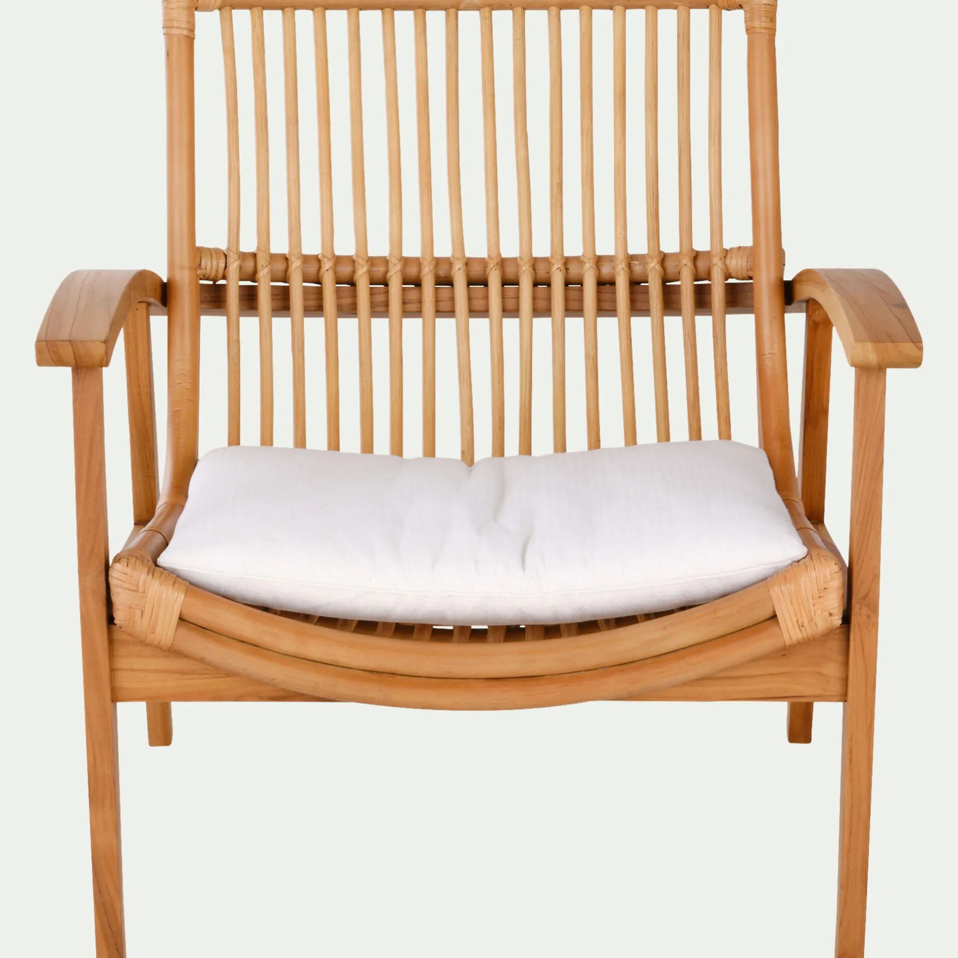 Structure : teck et rotin, finition naturelle Coussin : rembourrage en mousse polyuréthane (densité 20 kg/m) et housse 65% polyester 35% coton, motif chevrons, épaisseur 5cm.