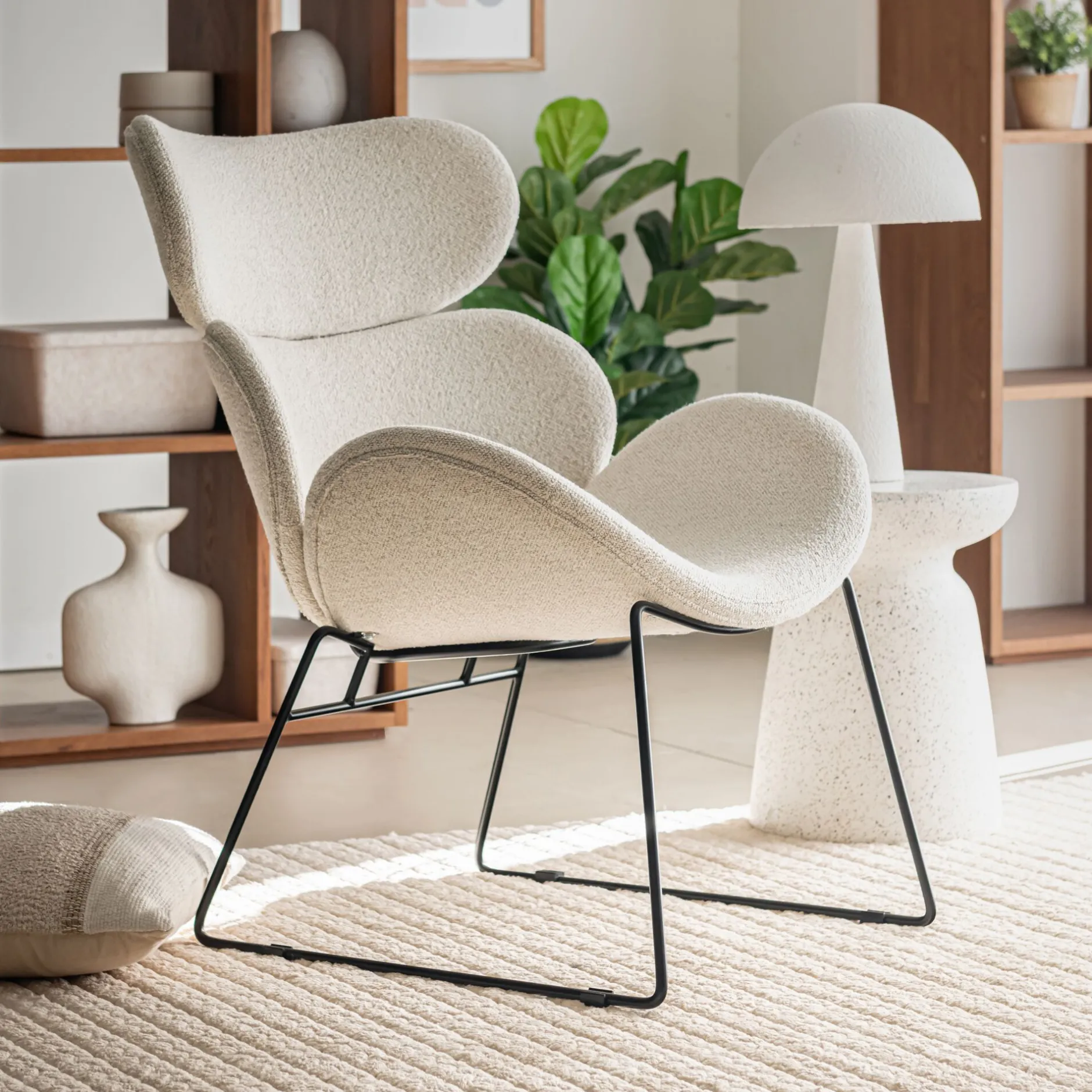 Ce fauteuil vintage aux formes arrondies alliant métal et tissu bouclette s’adapte avec brio à votre intérieur. Il s’intégrera à la perfection dans un salon jouant sur le mix des styles et des matières donnant un côté sophistiqué à votre décoration. Ce fauteuil beige arbore un piétement en acier noir soutenant une assise en un seul bloc afin de vous offrir un confort enveloppant. Design et rétro, ce superbe fauteuil donnera toute son allure à votre pièce de vie.