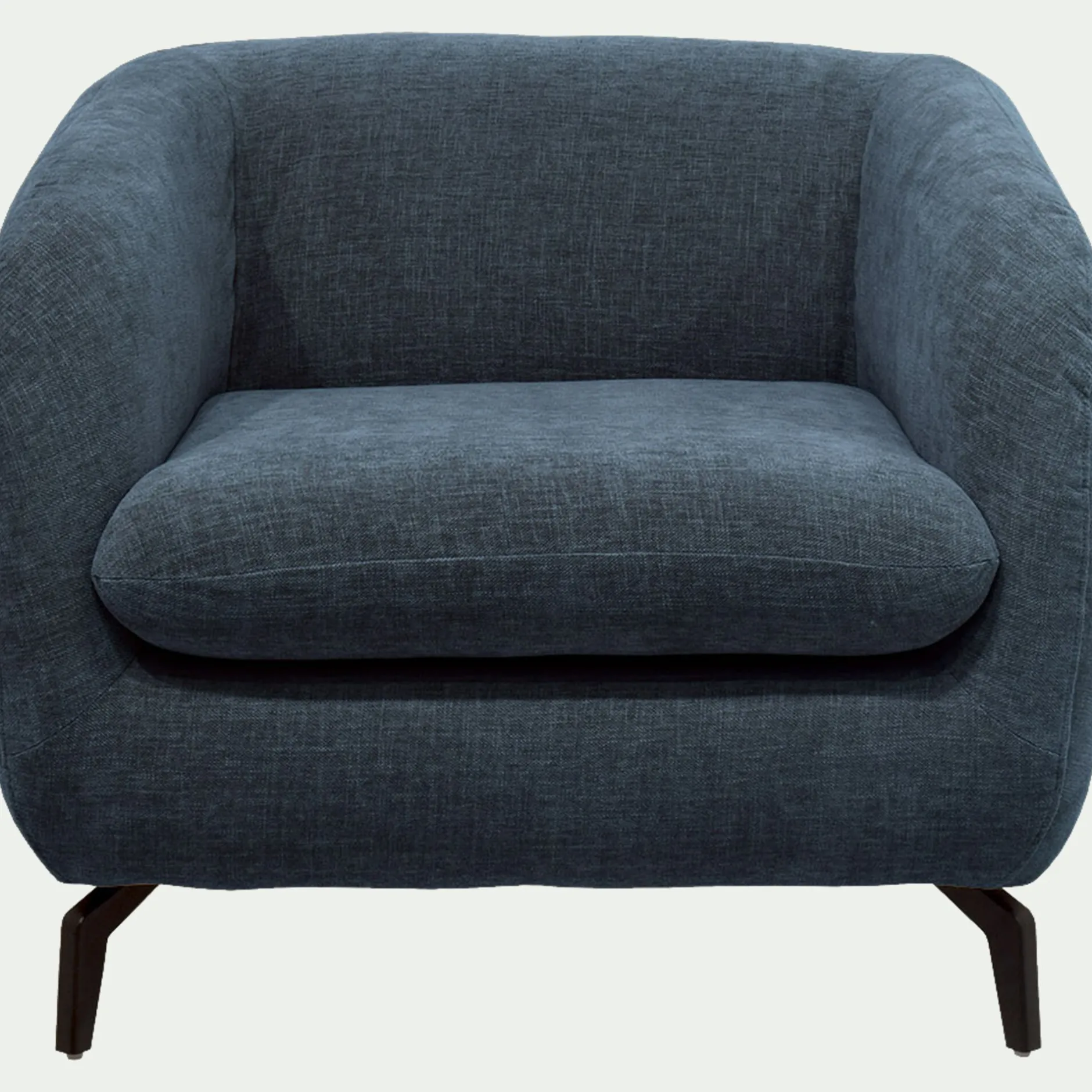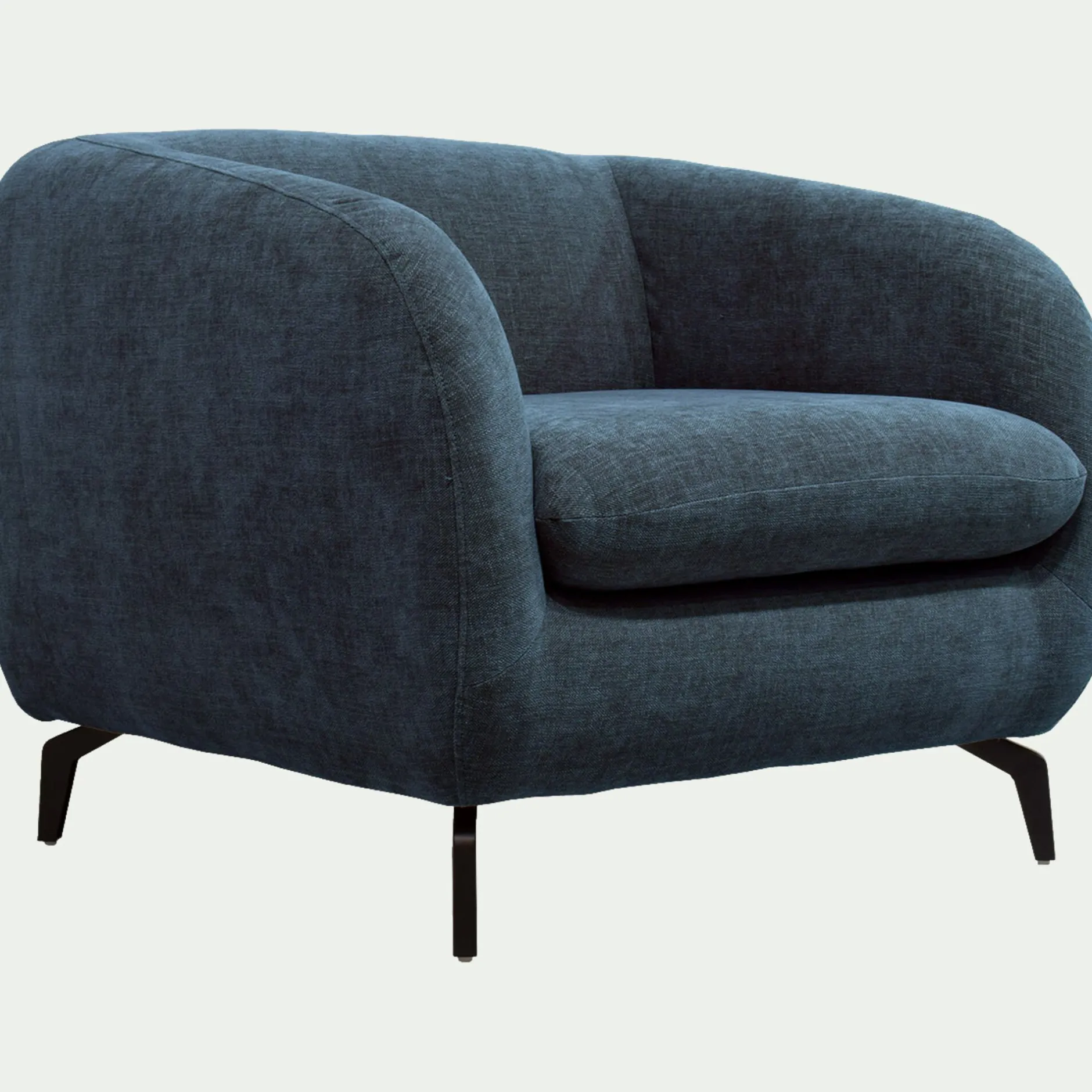 Un joli fauteuil en tissu doux pour profiter agréablement de votre salon. Un look contemporain et accueillant, sublimé par un piétement original en acier noir. Vous apprécierez la forme du dossier et des accoudoirs qui vous offrent un maintien optimal de votre dos pour un confort d’assise exceptionnel. Un fauteuil fabriqué en France, dans des ateliers proches de la ville de Bourge, qui incarne l’excellence du savoir-faire français. Un coloris bleu qui apporte une note citadine et raffinée à votre déco de salon.