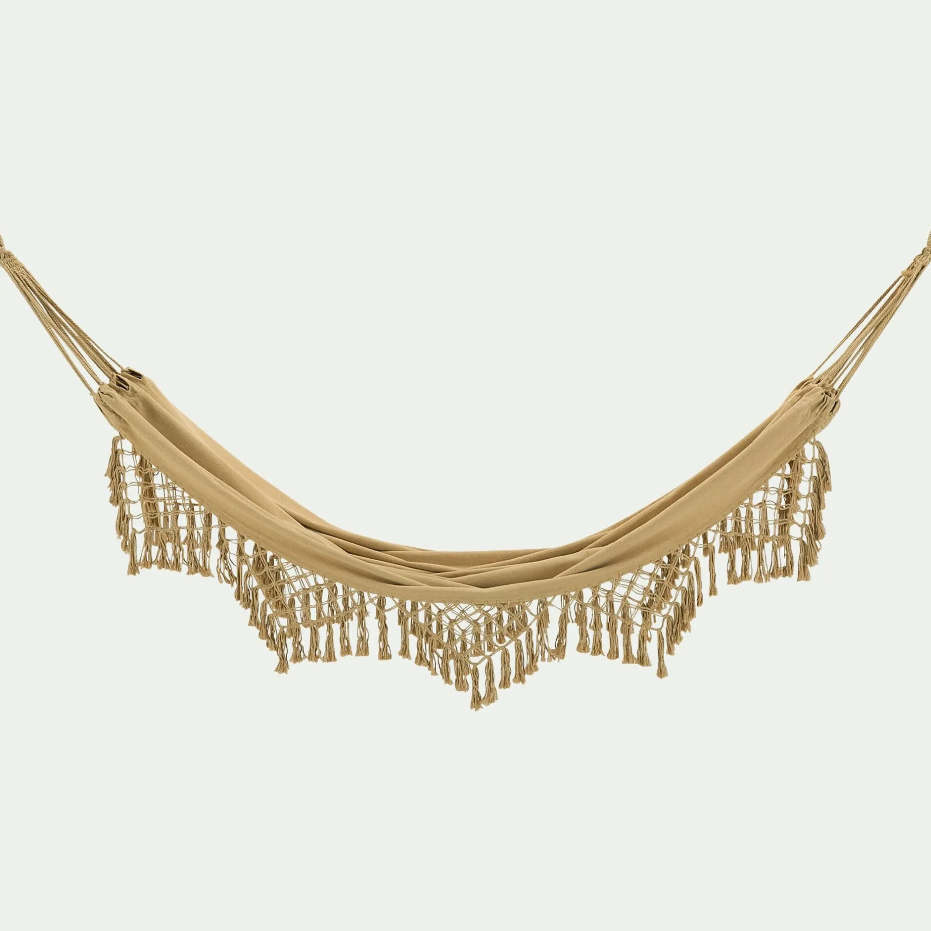 Puglia est le nom italien pour la région des Pouilles, région côtière où la mer est azur, les façades des maisons blanches sont baignées de soleil, le temps s’est arrêté pour des vacances… Un air de dolce vita s’invite à la maison avec ce hamac. Il suffit de se laisser bercer et de profiter d’une sieste confortable dans un tissu en polycoton qui laisse respirer. Le charme du hamac Puglia réside dans sa couleur beige nèfle, ainsi que dans ses franges qui en font un hamac aux finitions soignées.