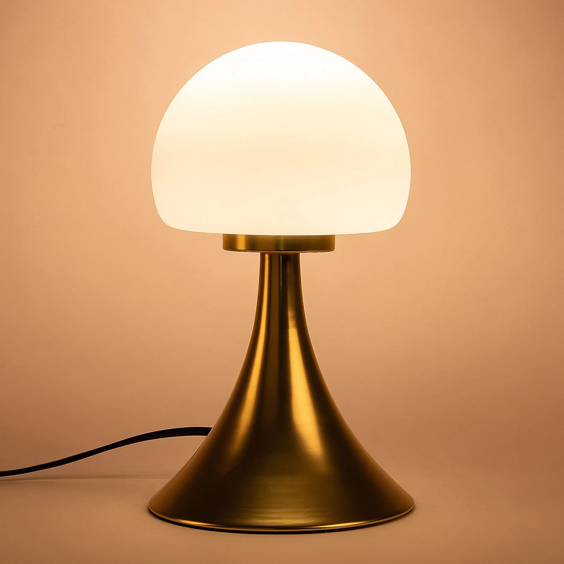 Cette jolie lampe vintage revisitée arbore une élégante forme de champignon. Son pied doré apporte une touche chic et raffinée à votre chambre à coucher. Une lampe à poser design qui vous permet de choisir votre intensité lumineuse. De ce fait, vous pouvez disposer d’une faible lumière pour continuer à lire lorsque votre moitié préfère dormir. Une lumière plus forte le matin lorsque vous avez besoin davantage de visibilité. Tactile, vous n’avez plus besoin de chercher l’interrupteur pour l’allumer, un simple effleurement, n’importe où sur la lampe, suffit à l’allumer.