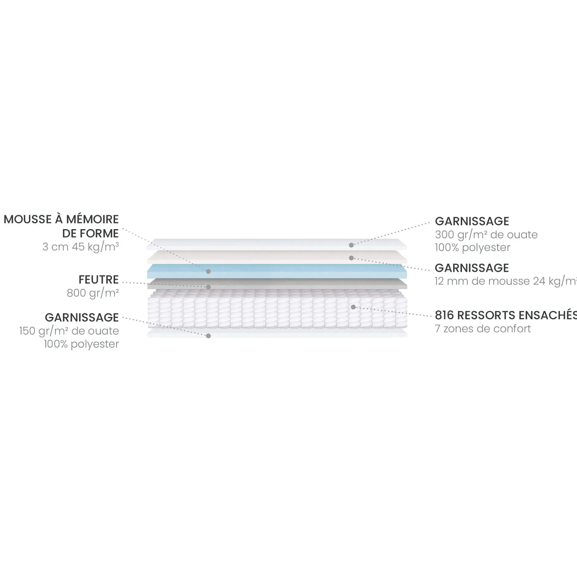 Âme : 716 ressorts ensachés en 140x200cm (70% recyclés, 30% non recyclés), ouate 100% polyester 300gr/m2 (70% recyclée, 30% non recyclée) et mousse viscoélastique 45kg/m3 12mm.