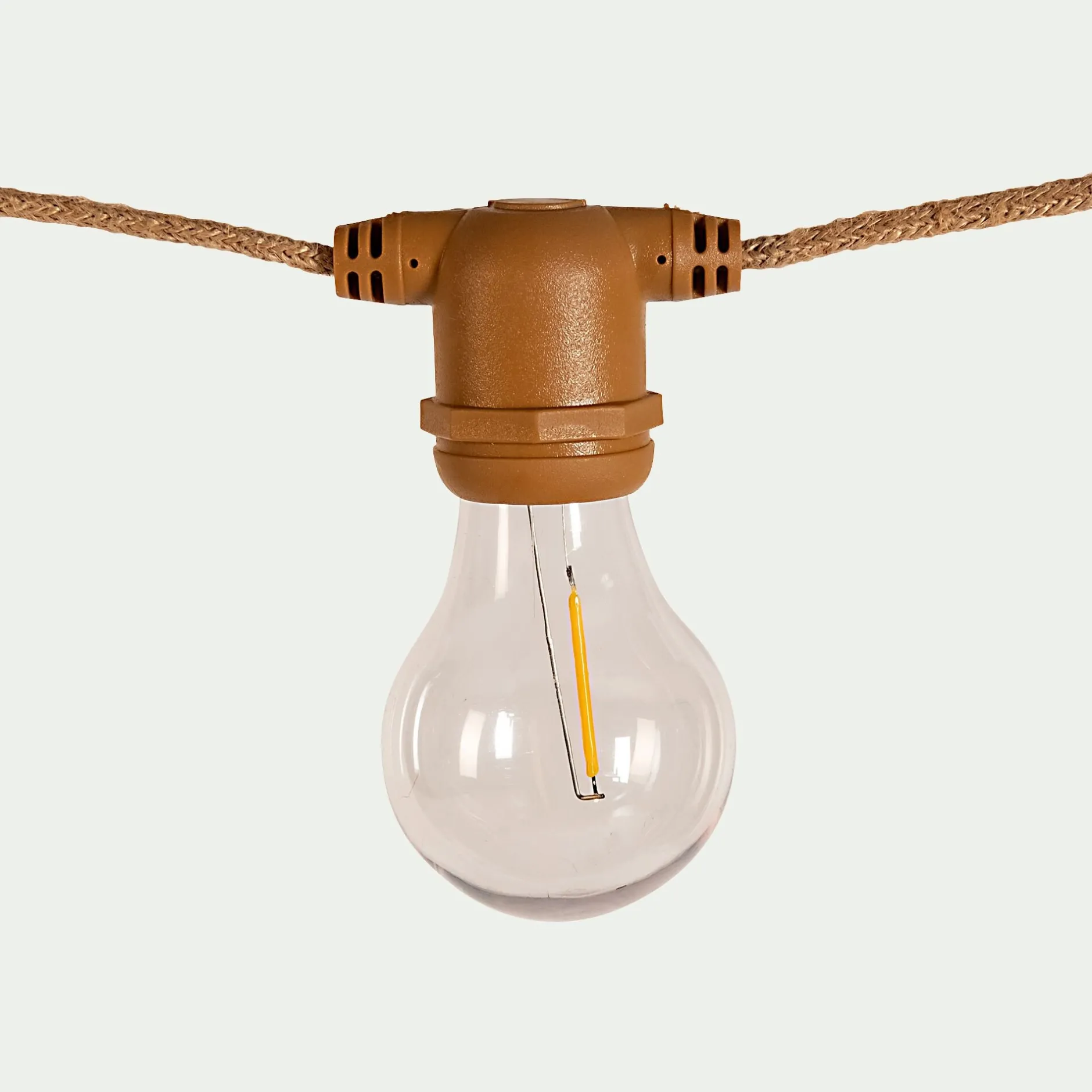 Une guirlande d’extérieur pour illuminer votre jardin. Elle est composée de 10 LED qui diffusent une lumière chaleureuse et conviviale. Un câble en jute qui apporte une touche naturelle et authentique à votre décoration de jardin. Placez la guirlande en hauteur, sur un mur ou au milieu de vos plantes pour les mettre en valeur.
