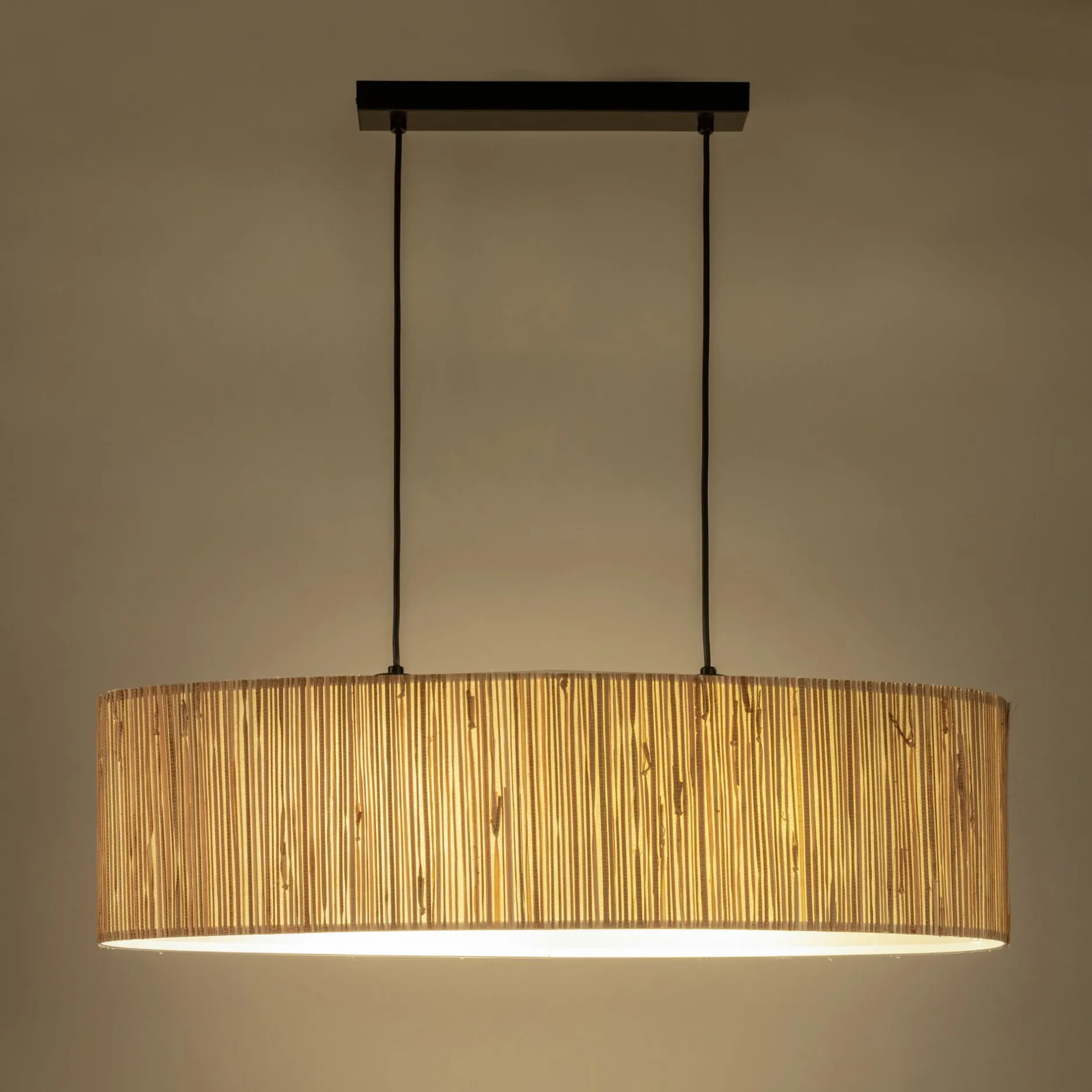Cette majestueuse suspension électrifiée habille vos hauteurs sous plafond avec charme et élégance. Circulaire, cette suspension naturelle dissimule en son sein deux lampes. Leur fusion donne vie à une suspension XXL qui s’impose comme la pièce maîtresse du séjour. Ce luminaire présente une structure en acier noir, délicatement soulignée par un abat-jour en algues. Les fibres naturelles sont tissées entre elles pour créer ce camaïeu de nuances dorées qui viennent illuminer la pièce. Originale, cette grande suspension en algues participe à une atmosphère accueillante et conviviale.