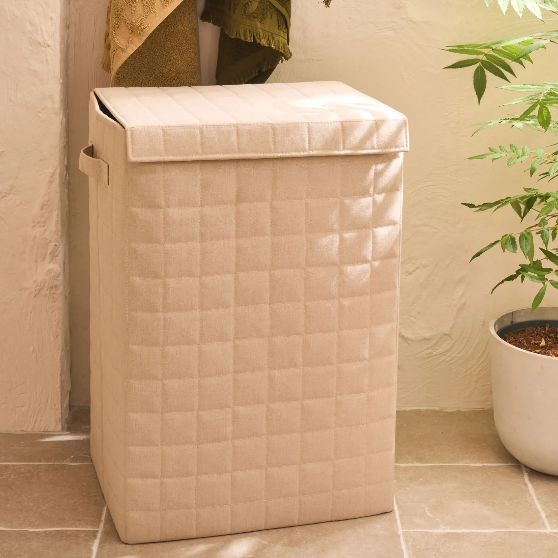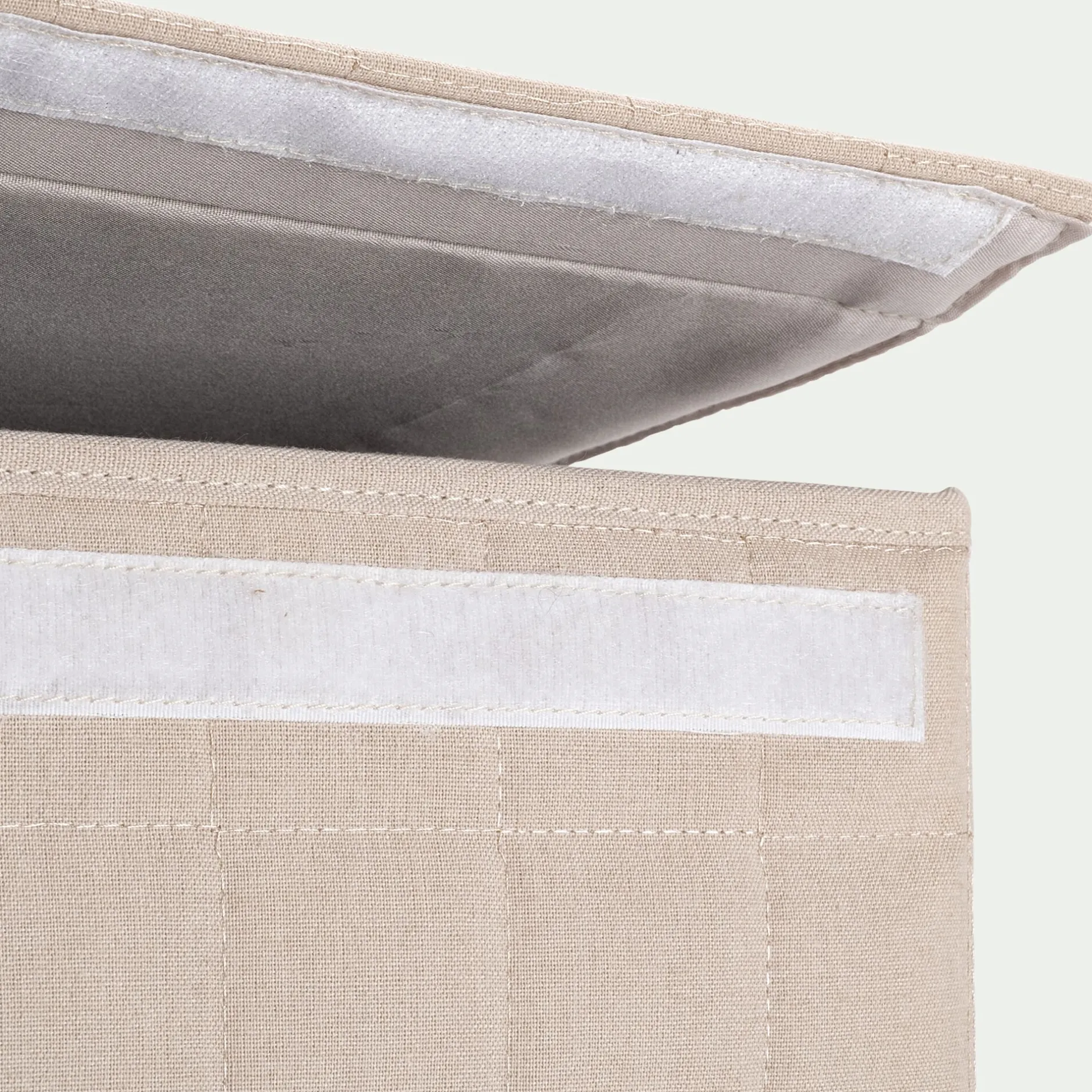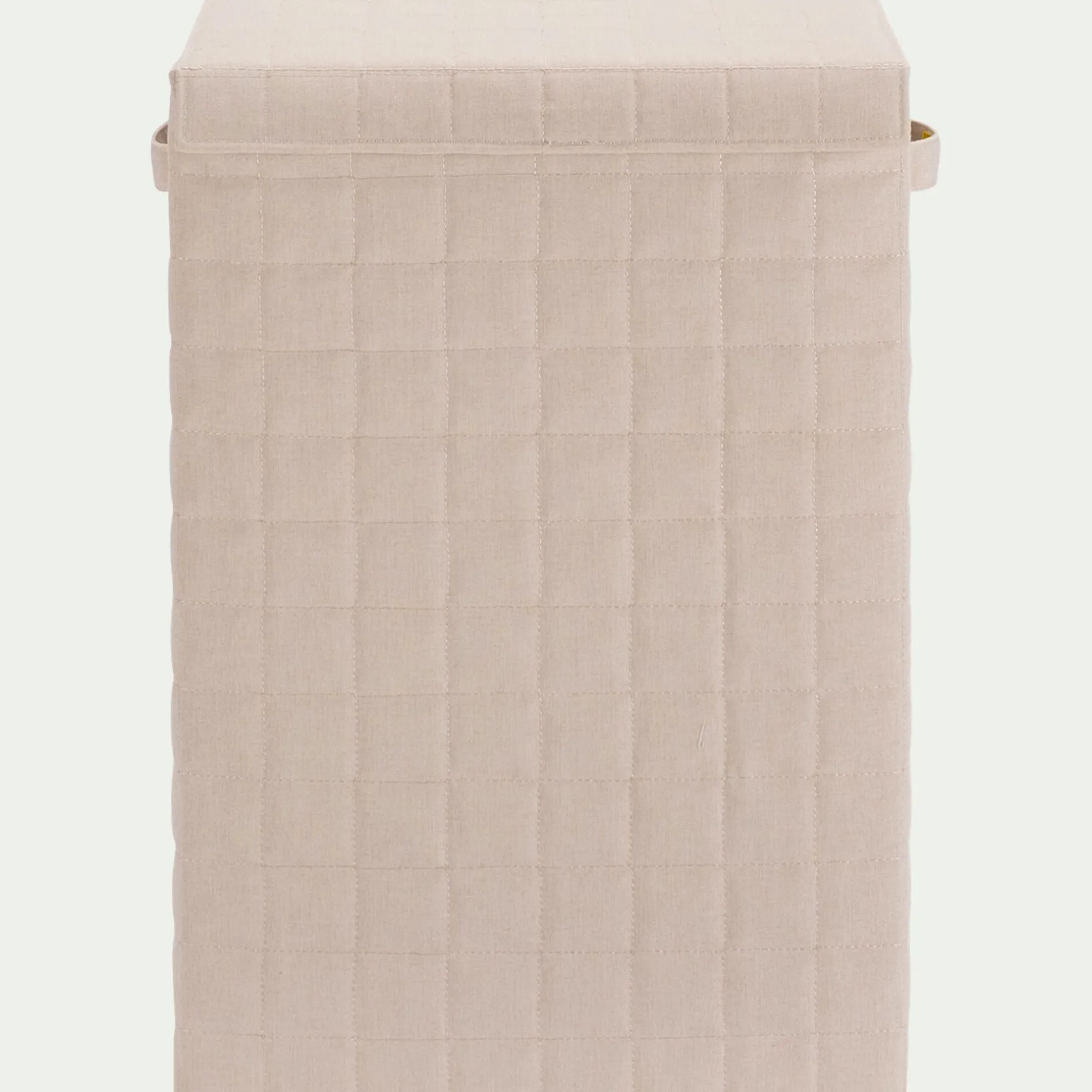 Ce panier à linge en tissu beige allie praticité et douceur visuelle. Son effet matelassé, souligné par des coutures blanches, lui confère un style cosy et chaleureux. Idéal pour ranger au quotidien, il accueille votre linge, tout en se fondant élégamment dans la déco. Doté d’un couvercle à fermeture velcro et de deux poignées latérales, il se déplace facilement d’une pièce à l’autre. Un indispensable aussi esthétique que fonctionnel.