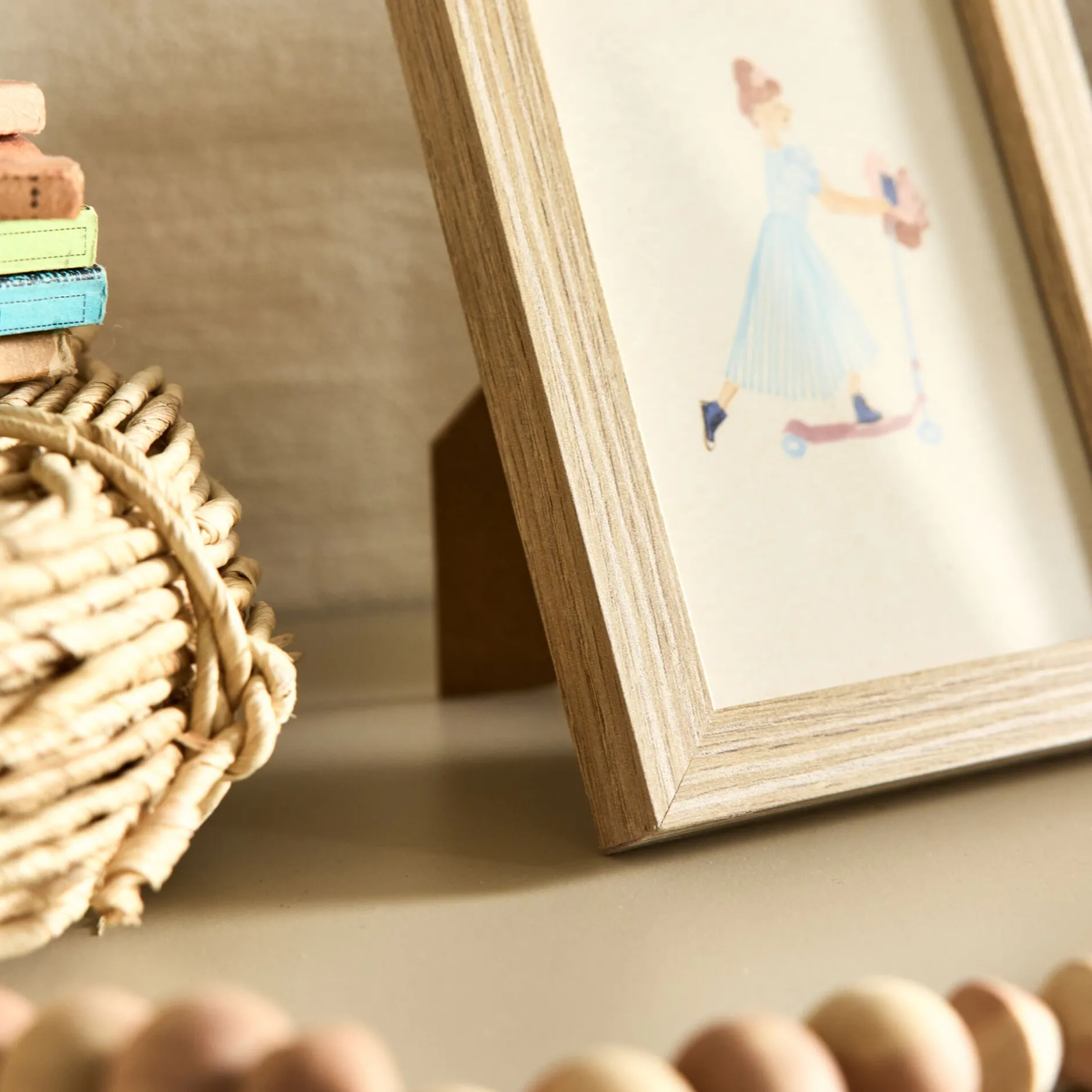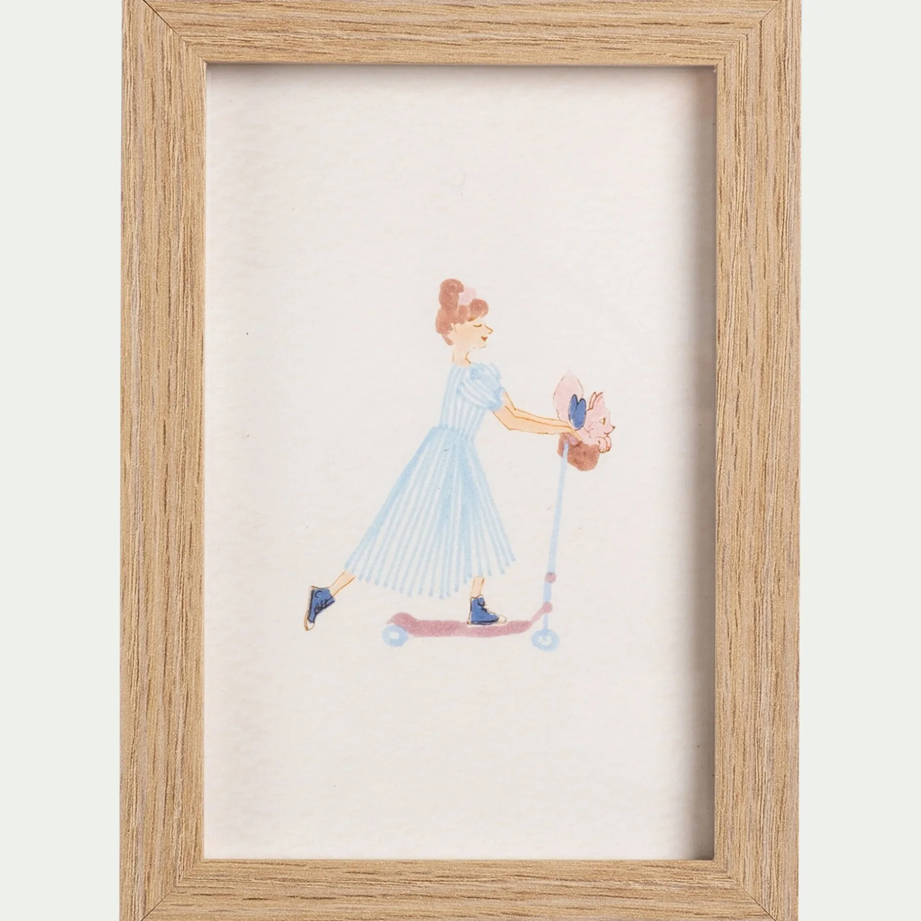 Dans ce cadre en bois de 12×17 cm, une scène pleine de vie prend place derrière le verre : une fillette en robe à rayures bleues file joyeusement sur sa trottinette, son chiot bien installé dans le panier, la truffe au vent. À suspendre ou à poser, cette décoration tendre et pétillante apportera une touche d’insouciance et de gaieté à la chambre enfant.