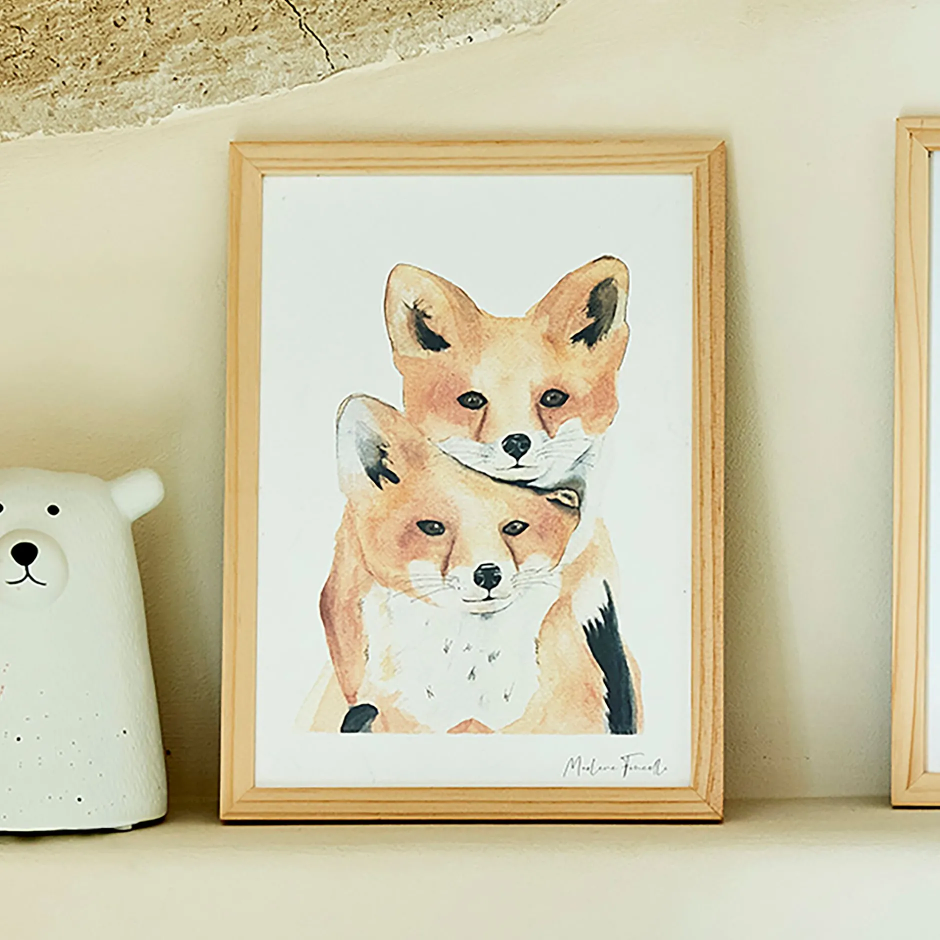 Ce cadre aux motifs animaux et son design confectionné avec la délicate technique de l‘aquarelle constituent une parfaite décoration murale pour la chambre de votre enfant. Ici, au format A4, ce dessin, réalisé par l’artiste française Marlène Fancelli, est encadré dans un beau cadre en bois de pin et protégé par une vitre de plexiglas. Avec ces deux renards enlacés, ce cadre au format A4 se marie avec des tons chauds comme des coloris pastel. Associez cette affiche avec d’autres cadres de la même collection et quelques miroirs afin de créer une décoration harmonieuse et cocooning qui saura apaiser votre bambin. Grâce à la présence d’accroches au dos du cadre, vous pourrez l’installer en toute simplicité.