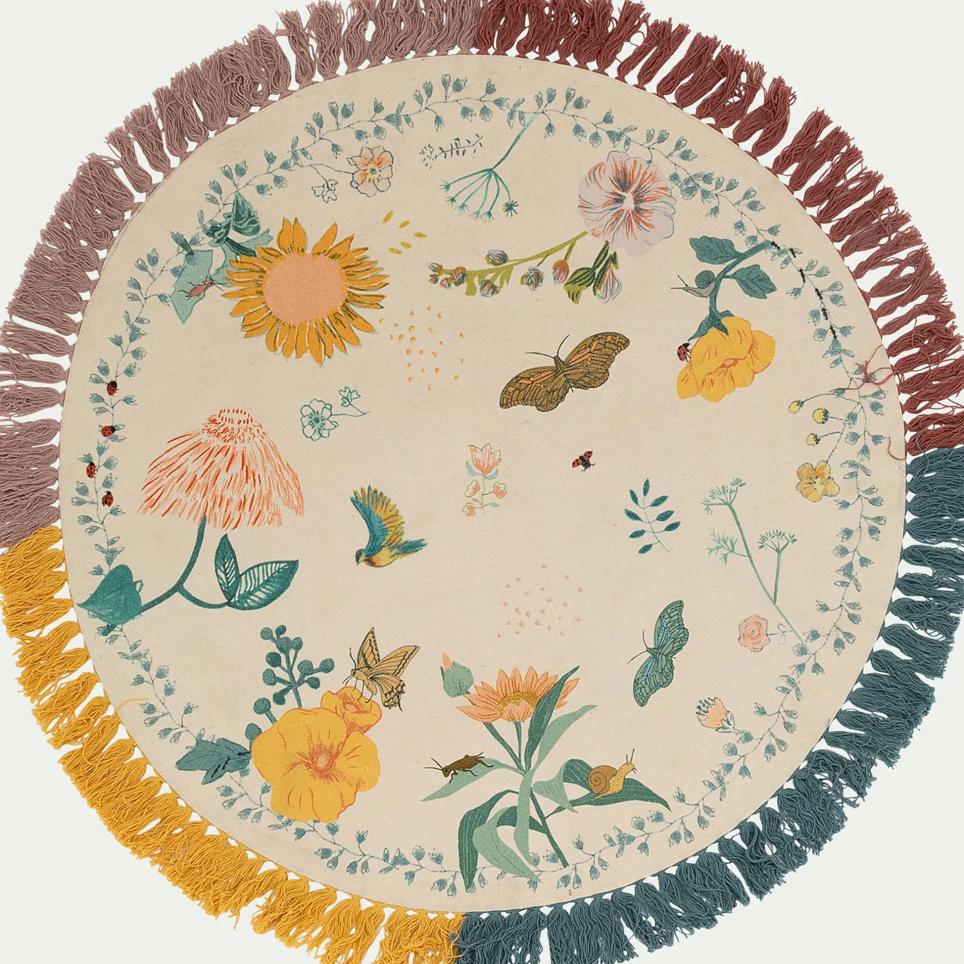Ce tapis rond d120cm s’invitera dans une chambre d’enfant dès son plus jeune âge, pour proposer une ambiance douce et poétique. Avec ses illustrations, le soleil rayonne, le printemps montre ses plus beaux atouts. La représentation des fleurs aux couleurs acidulées évoque le charme et le naturel. Ces pompons aux multiples couleurs créés l’originalité. Antidérapant, il assure la sécurité de votre enfant à tous les instants. Au sol, en descente de lit ou au milieu d’une pièce, ce joli tapis pourra servir de déco ou de tapis de jeux pour les éveillés qui aiment s’inventer des histoires et partir à la découverte de la botanique.