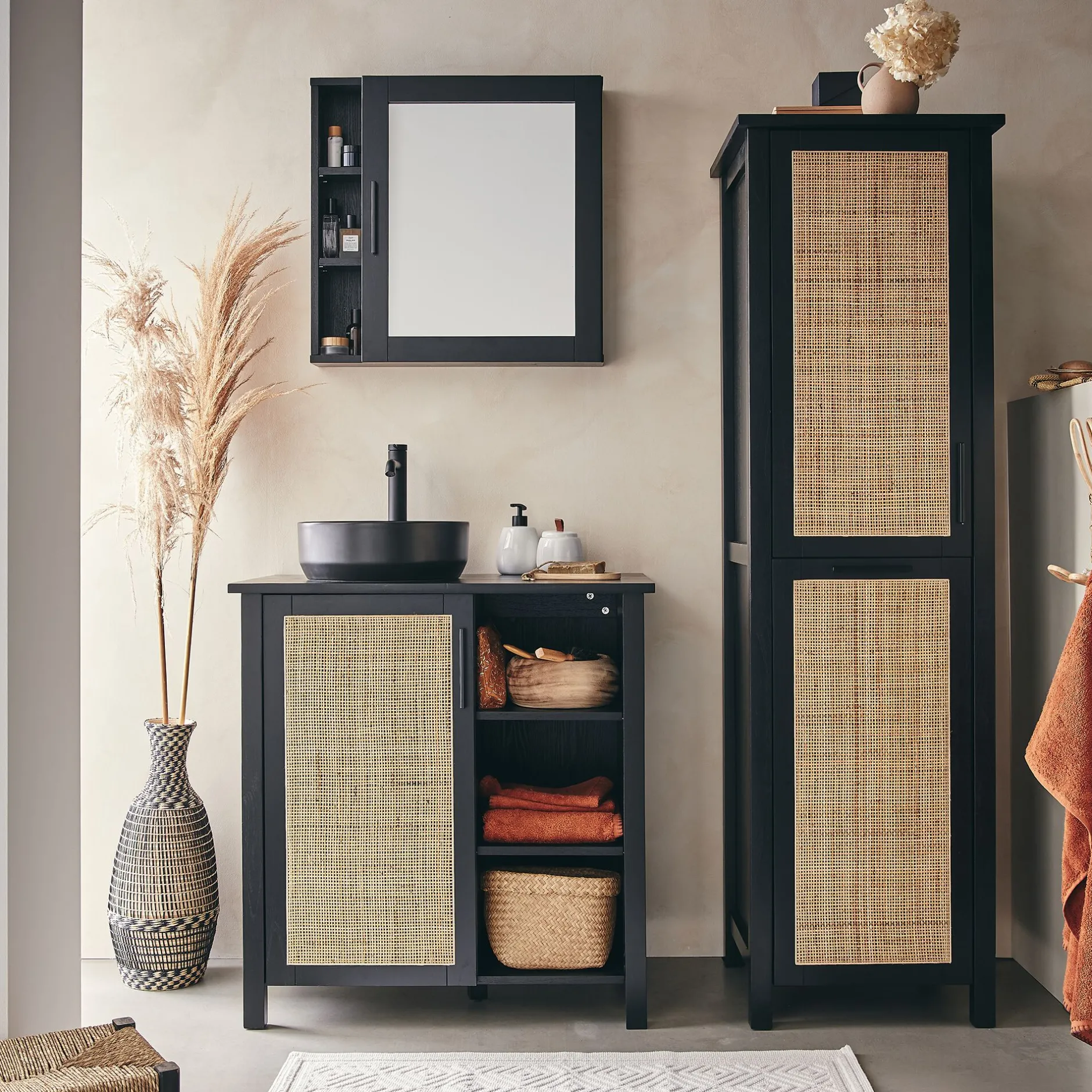 Salle de bain en bois noir et cannage