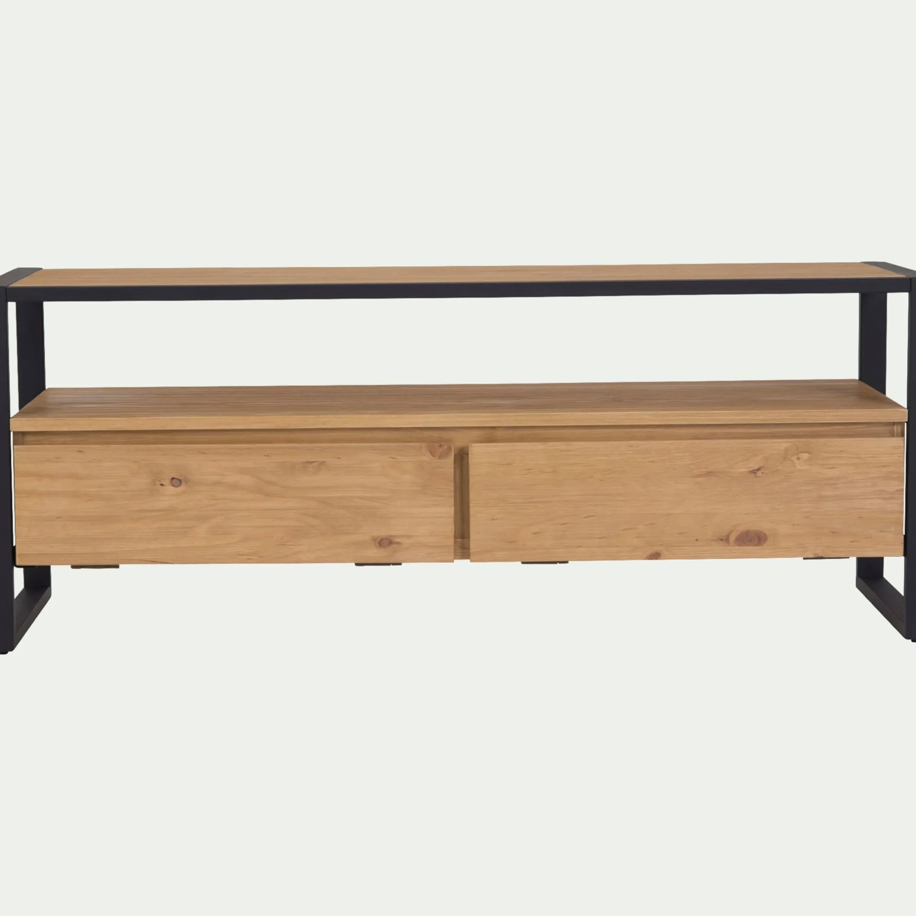Ce beau meuble télé réussit avec brio l’alliance entre la robustesse du métal et la chaleur du pin massif. Sa tablette supérieure pourra accueillir votre télévision et sa niche dissimulera vos équipements multimedia. La combinaison du métal et du bois apporte un style atelier à son ensemble, lui donnant une place toute désignée dans une atmosphère inspirée par les matières brutes et des teintes chaleureuses.
