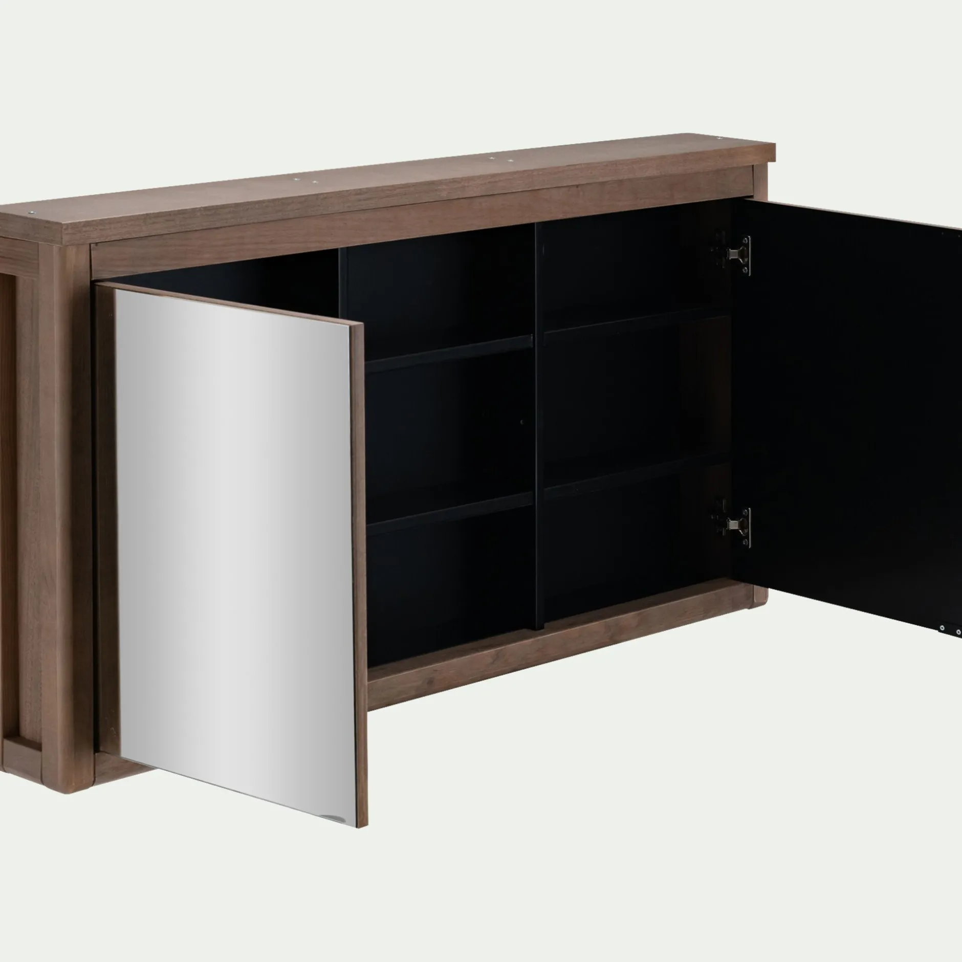 Ce grand miroir double de salle de bain est idéal pour placer au dessus d’un meuble vasque double. Il mesure 120×42 cm, ainsi il convient parfaitement aux salles de bains adaptées à deux personnes. Une fois fixé au mur, ce miroir en bois de pin plaqué eucalyptus fait également office de rangement. Il se compose de petites tablettes, idéales pour ranger produits beauté, bijoux, parfums et bougie parfumée. Vos soins restent à portée de main et votre salle de bain est mieux organisée. Ce grand miroir mural est confectionné en pin avec des finitions en eucalyptus : une belle pièce qui s’intègre parfaitement à une décoration naturelle.