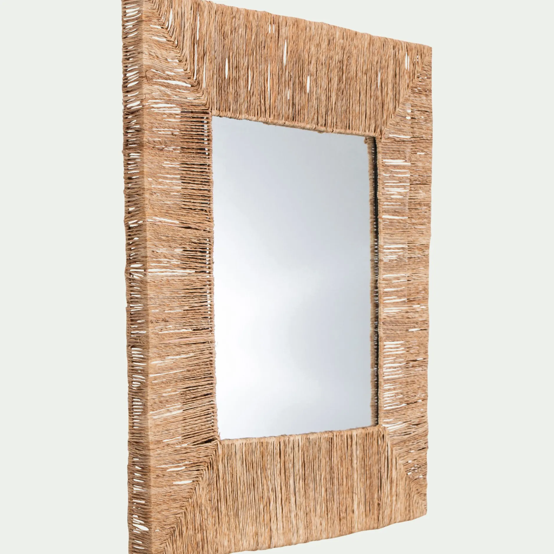 Décorez les murs de votre chambre ou de votre salon avec un miroir à suspendre. Au-delà d’être des objets déco intemporels, les miroirs permettent d’agrandir visuellement la pièce et de l’illuminer. Le miroir déco Vendres arbore une structure carrée faite en bois et métal. Le jonc de mer, des fibres dorées et résistantes, vient ensuite s’entrecroiser sur la structure pour offrir ce tissage brut. Ce miroir carré mesure 76×76 cm. Seul ou en accumulation, il habille votre intérieur de son design rustique et de son reflet radieux.