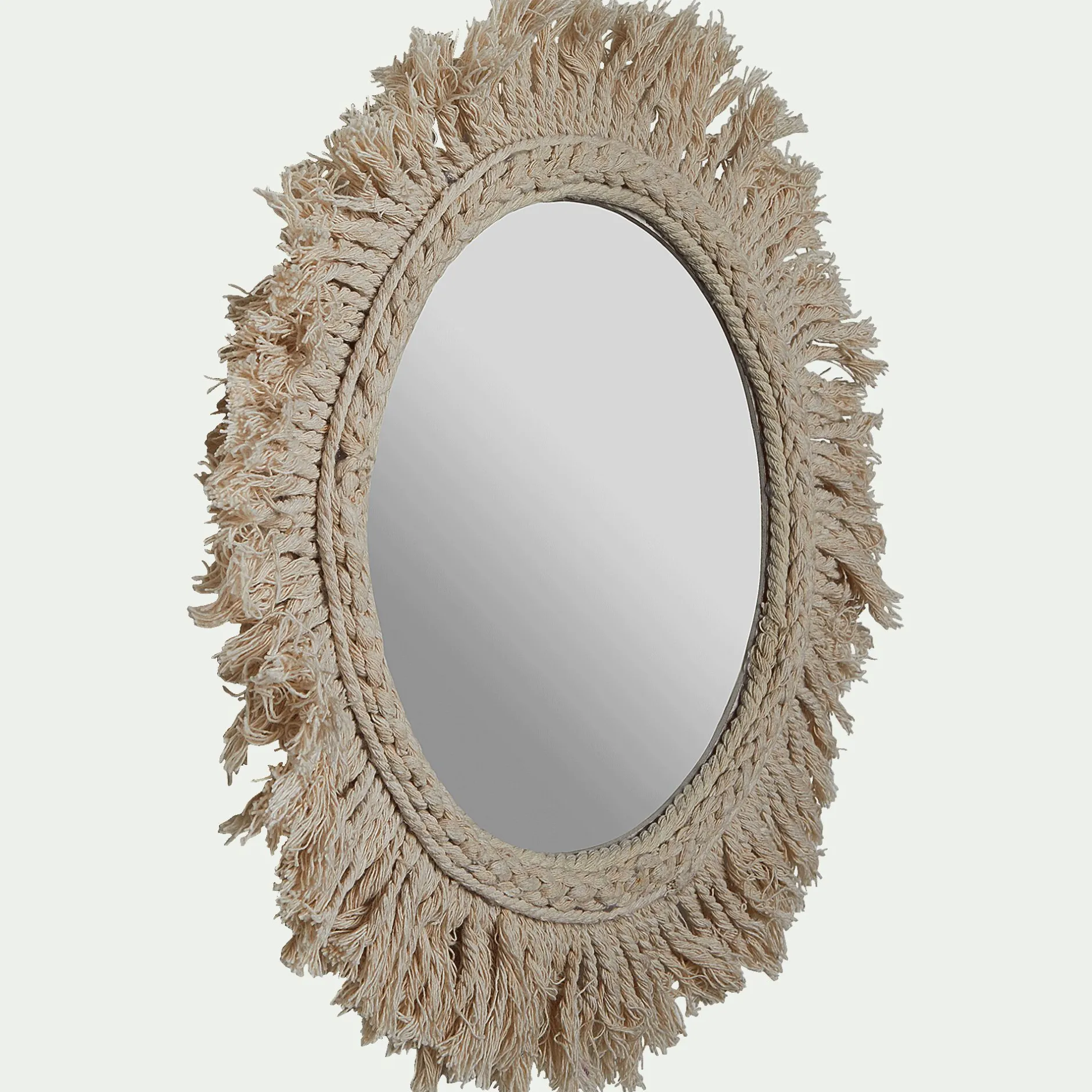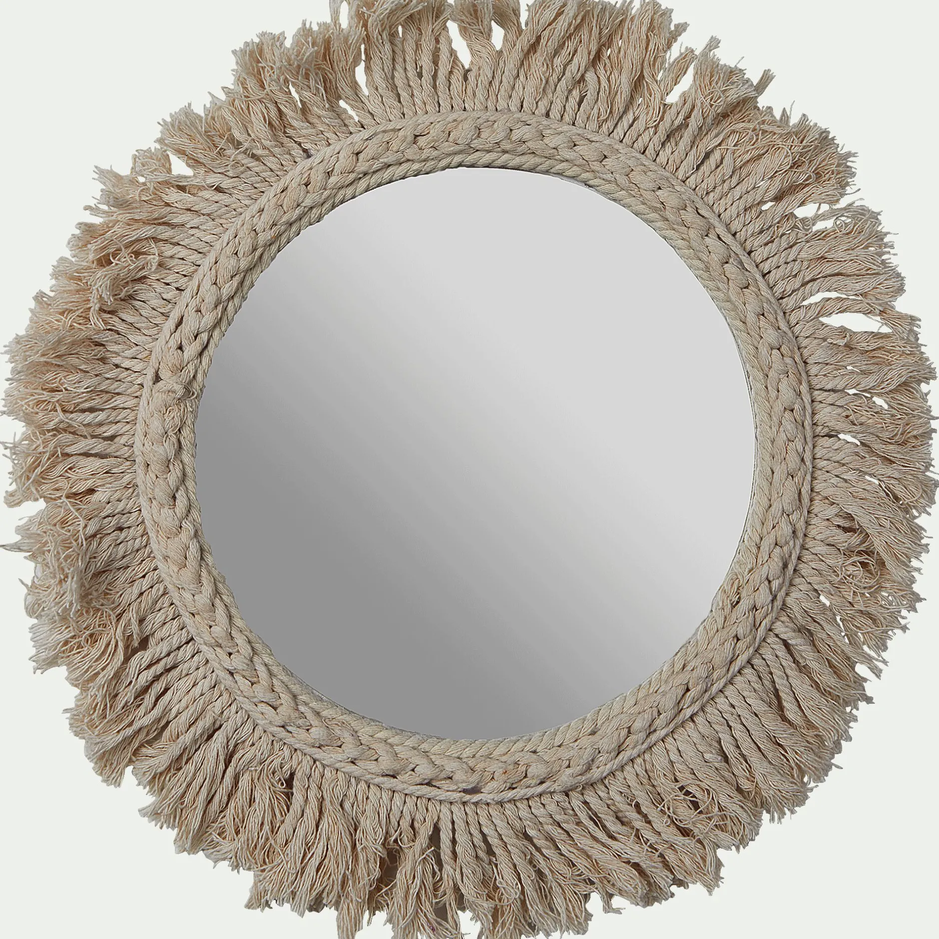 Ce petit miroir déco représente un soleil stylisé, astre qui rythme nos jours mais aussi notre humeur. Symbole de la lumière, de la beauté parfaite et de la noblesse, il est une source d’inspiration intarissable en décoration. Le petit miroir au centre fera naître la lumière grâce à son pouvoir de réflection. La beauté parfaite se retrouve dans la forme ronde, infinie. La noblesse est interprétée par le coton : fibre naturelle douce et blanche, elle encadre ce miroir et incarne les rayons du soleil. Son tressage est régulier au centre puis explose en une frange luxuriante pour un résultat chaleureux. Associez ce miroir à d’autres miroirs soleil de notre collection pour recréer sur votre mur une voie lactée étincelante.