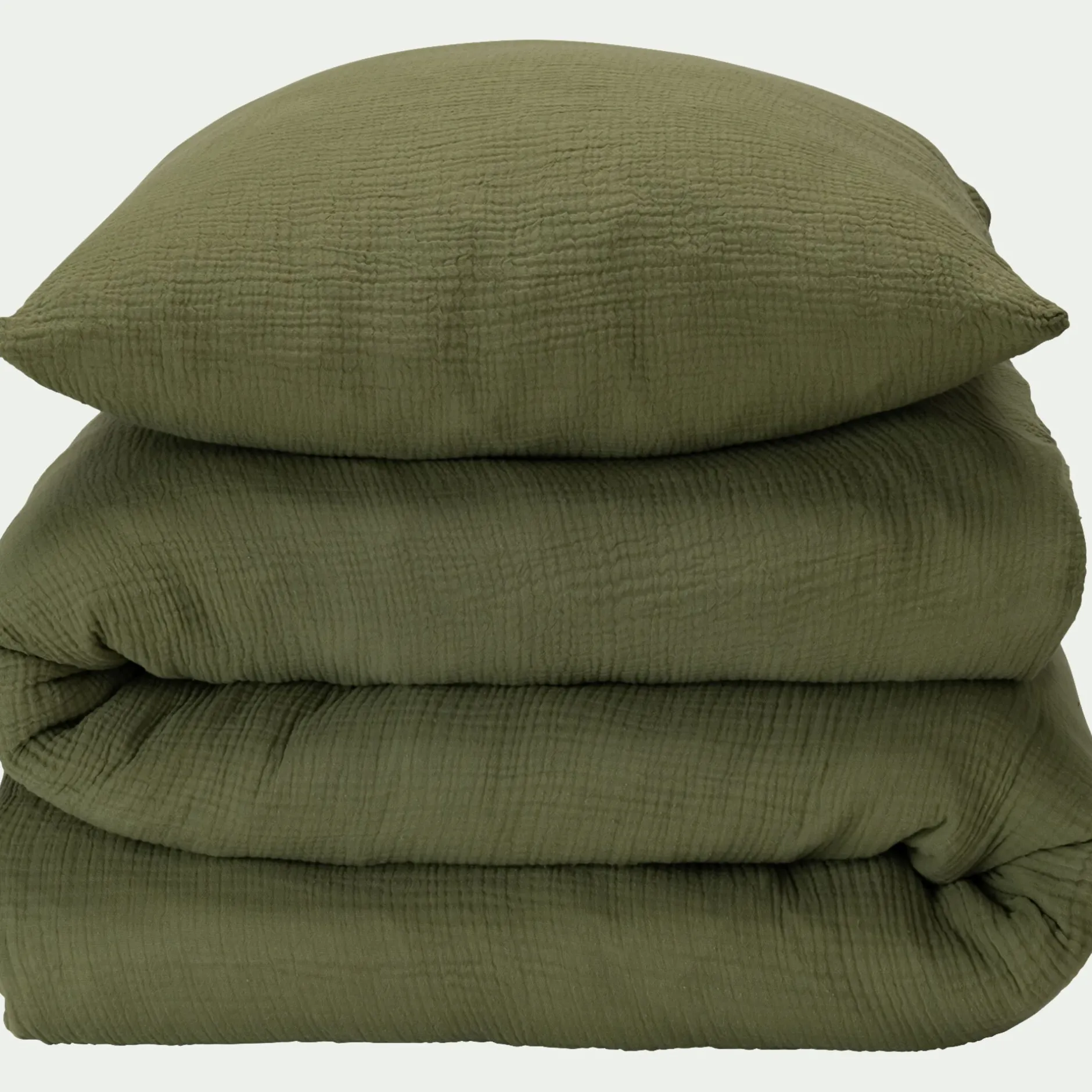Aménagez une chambre chaleureuse et agréable à vivre avec la parure de lit Baleti. Confectionnée en double gaze de coton, cette parure verte arbore une texture froissée, à la fois charmante et très pratique d’entretien. La double gaze vient apporter une touche de confort sans pareil à votre lit, tissu doux et réconfortant que l’on ne se lasse pas de toucher. Cette parure unie se compose d’une grande housse de couette de 260×240 cm. Celle-ci s’accompagne de deux taies d’oreiller assorties de 63×63 cm. Un ensemble élégant, à la fois chic et bohème, qui apporte à la chambre charme et caractère.