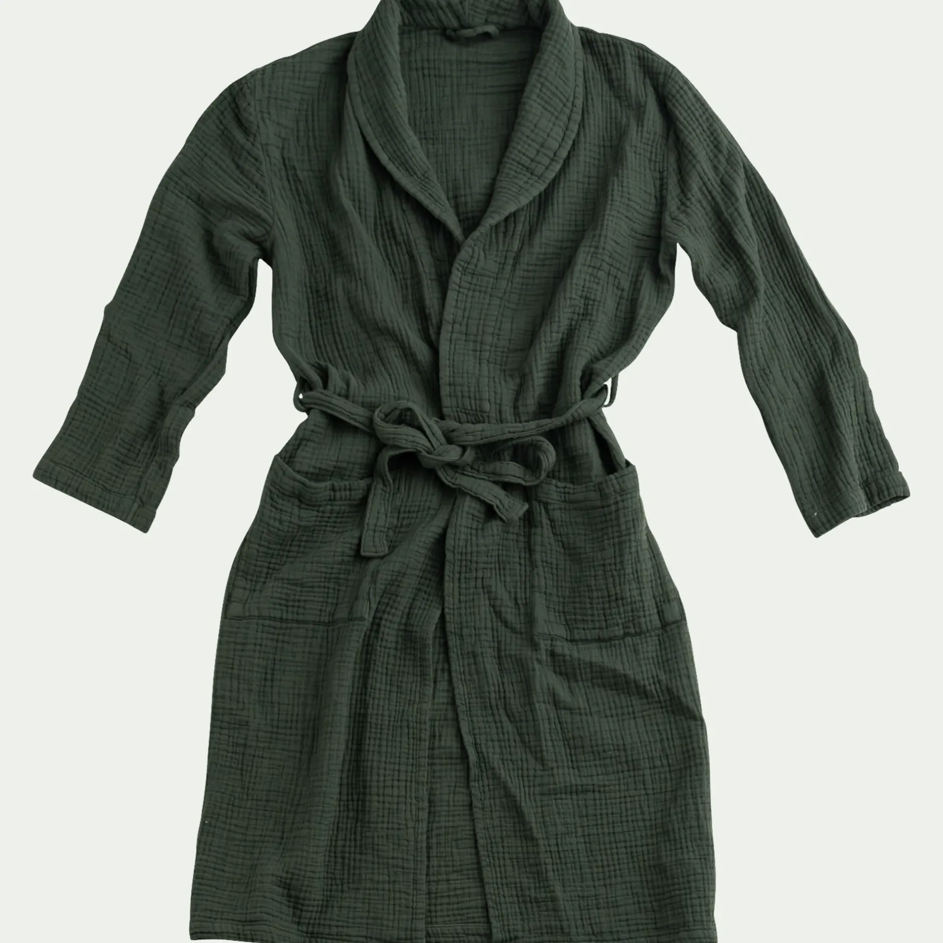 Ce peignoir vert en L/XL, confectionné en quadruple gaze de coton, offre un confort exceptionnel grâce à sa texture douce et aérienne. Parfait pour se détendre après une douche ou un bain, il présente un col châle, deux poches fonctionnelles et une ceinture à nouer autour de la taille. Ce peignoir en gaze de coton incarne une touche de couleur et de confort pour vos moments de détente à la maison.