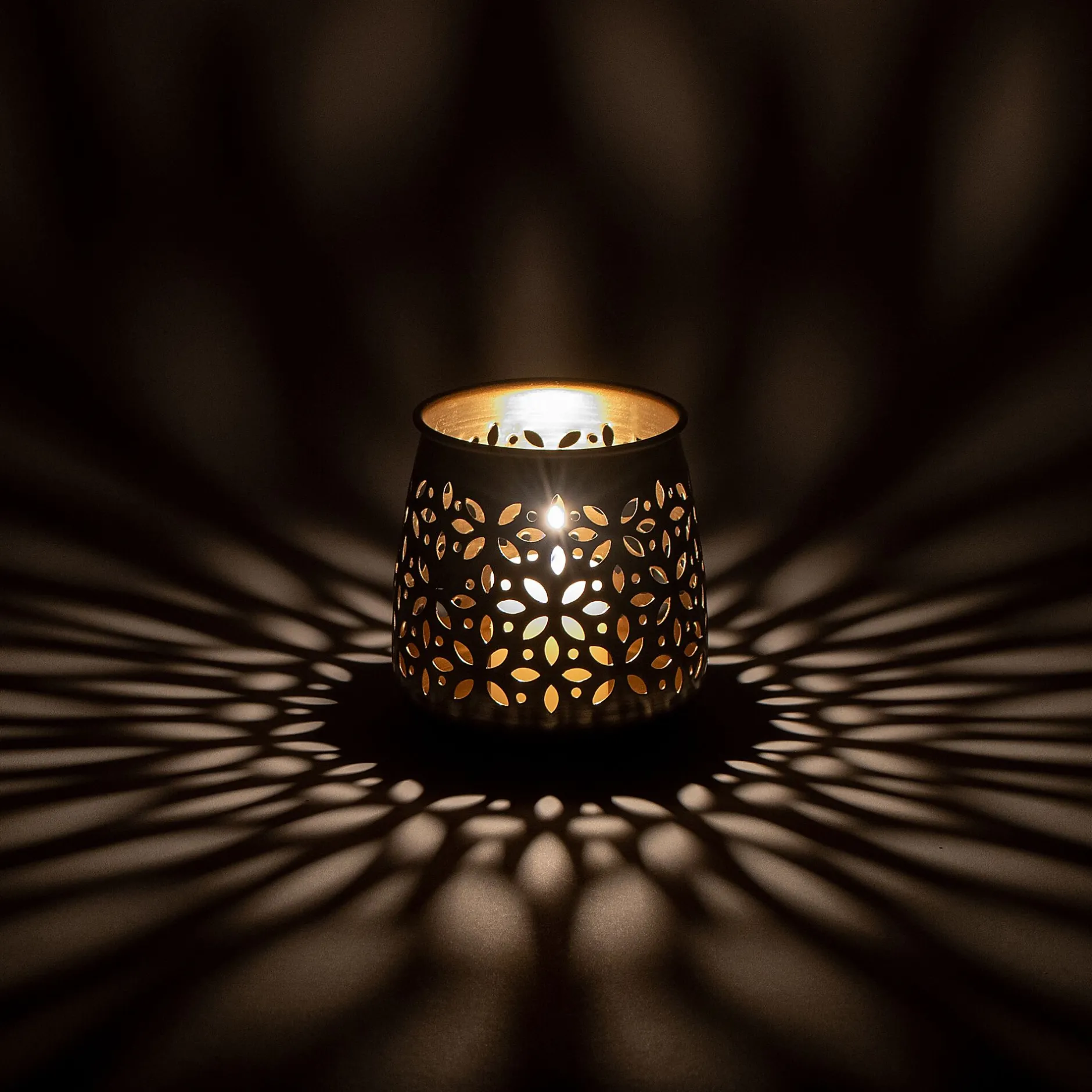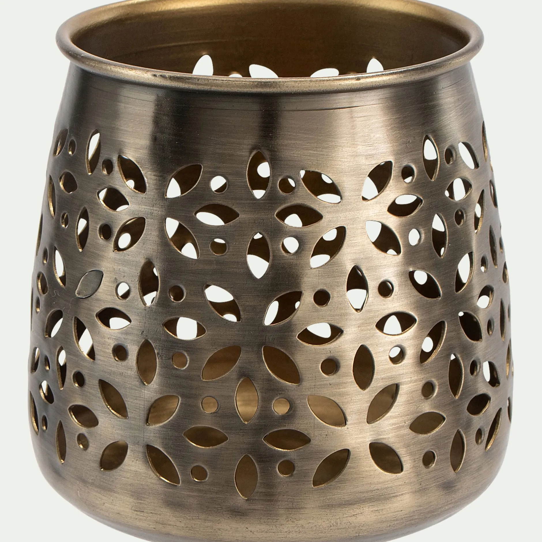 Alassah est un petit photophore confectionné en fer. Le métal est ici travaillé pour créer une forme arrondie, tout en douceur. Des formes organiques ont ensuite été découpées dans la matière pour offrir un jeu d’ombre et de lumière une fois la bougie allumée. Ce motif ajouré évoque des fleurs ou des rosaces : des formes régulières et délicates qui font le charme de ce photophore doré. Placez une bougie en son coeur. La flamme vacille et offre un spectacle de toute beauté le soir venu. Un photophore en métal que l’on aime sur une console ou une table basse.