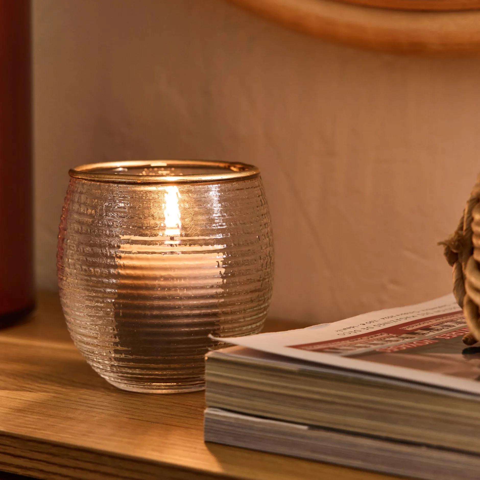 Tout en rondeur, le photophore Solias se distingue par sa matière striée. Le verre transparent est subtilement travaillé pour offrir de la texture, ainsi qu’un effet visuel sur la lueur de la bougie. Ce petit photophore arbore un liseré doré, finition élégante qui convient parfaitement à une décoration festive.