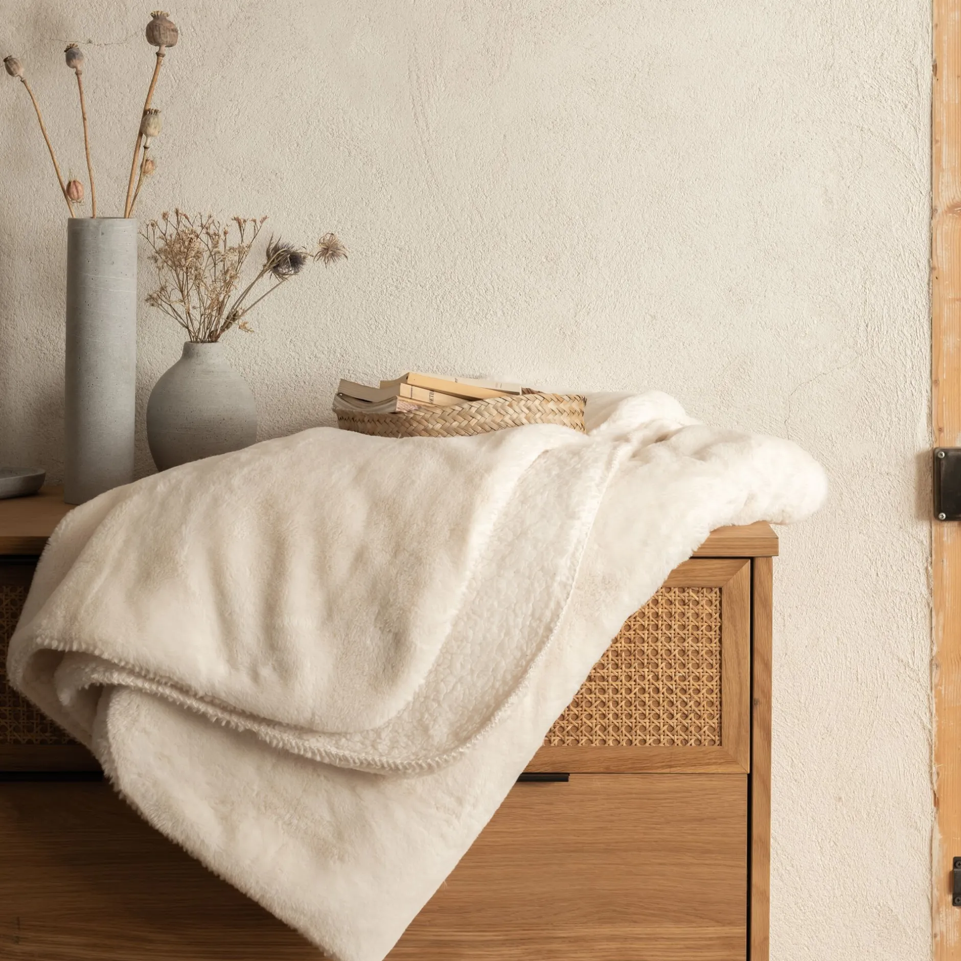 Le plaid Marius incarne la promesse d’un moment de détente d’une douceur sans pareille. Comme couverture en hiver ou accessoire déco en été, ce plaid en imitation fourrure réchauffe avec aisance et raffinement un intérieur. Un côté arbore un aspect moutonneux, inspiré des bergers de nos montagnes. L’autre stimule et rythme la décoration de son blanc ventoux, doux et apaisant. Un ensemble contrasté dans lequel vous blottir le soir, au coin du feu.