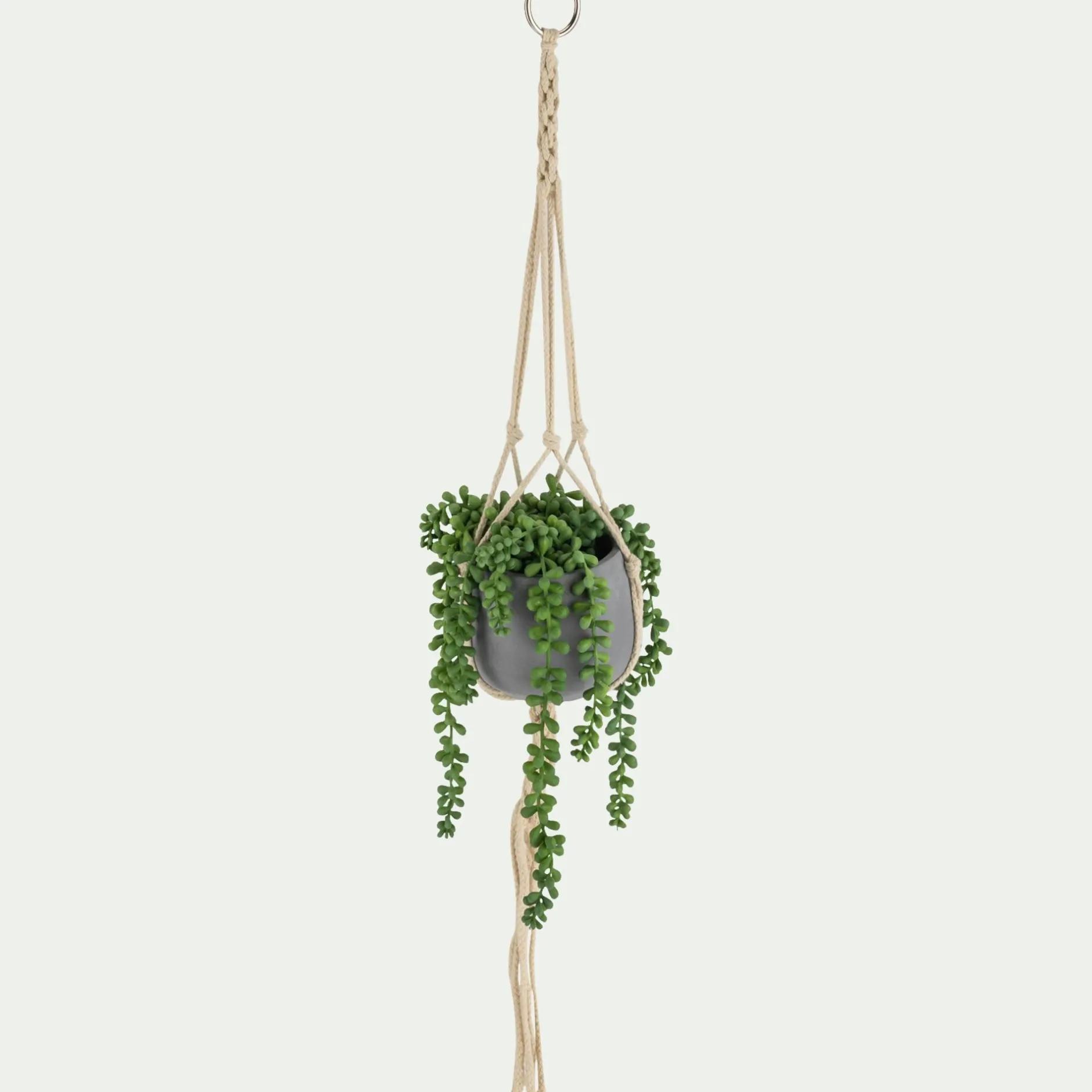 Cette succulente à suspendre est idéale pour apporter une touche de décoration à votre intérieur comme à votre extérieur. Bénéficiez de tous les avantages d’une vraie plante sans ses inconvénients. Avec sa suspension en lin et son pot en ciment, elle donne à votre pièce des allures bohèmes cocooning. Suspendez-la à votre plafond avec d’autres types de plantes artificielles afin de créer un véritable havre de paix et de vous créer un coin de tranquillité dans votre maison.