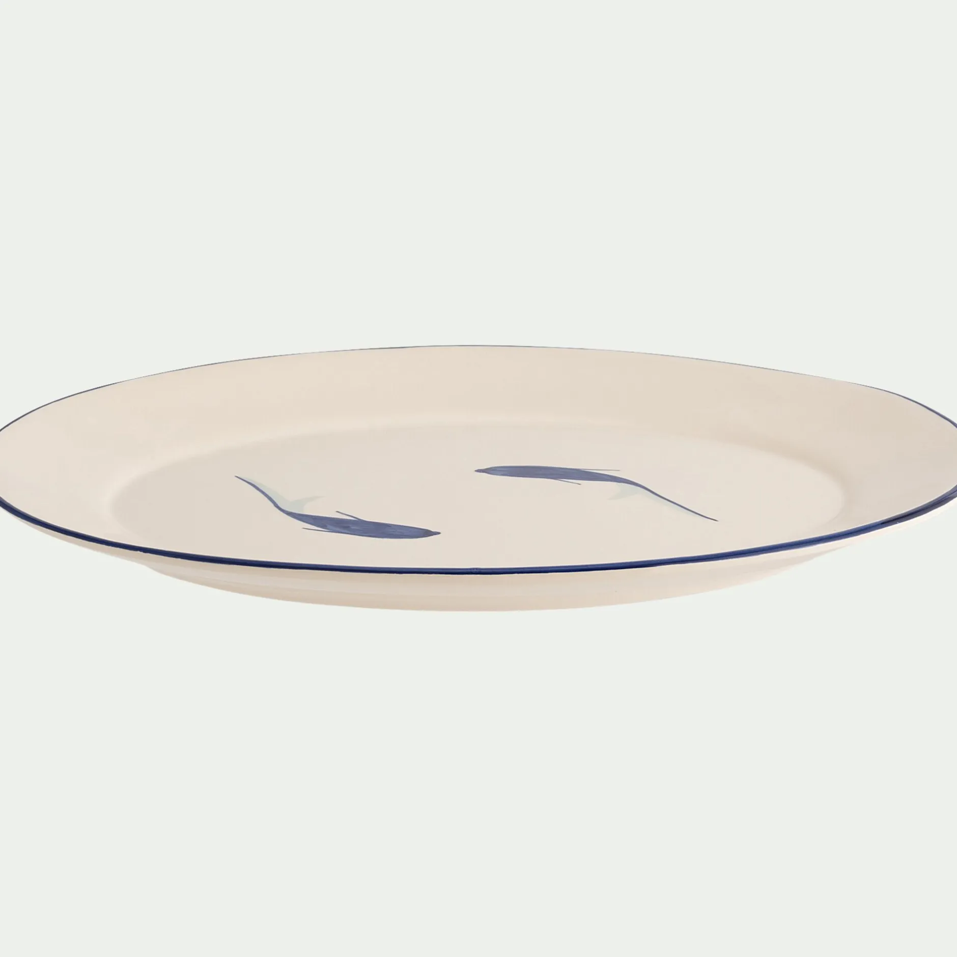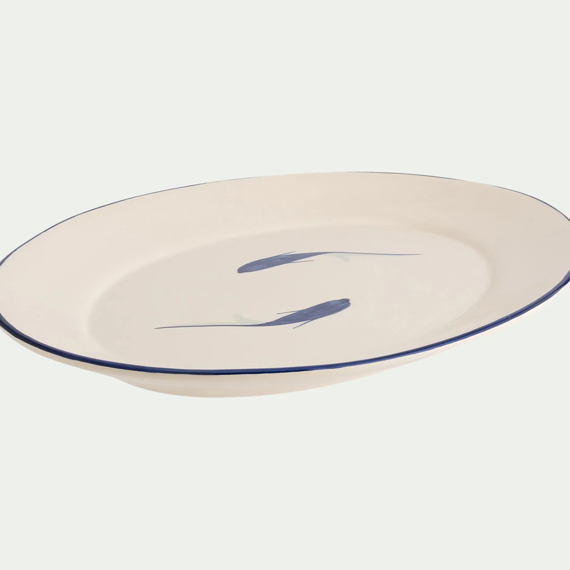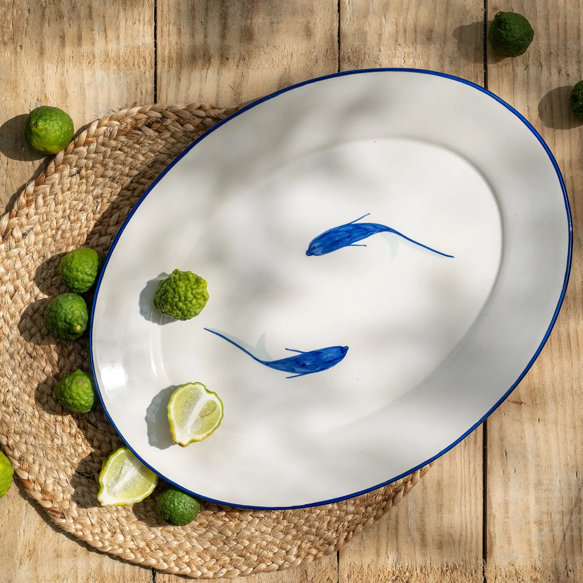 Le plat de présentation Anchova séduit par son design à la fois sobre et poétique. Confectionné en faïence blanche, il arbore un motif bleu où deux petits poissons semblent nager avec élégance. Son format ovale en fait une pièce polyvalente, idéale pour servir un rôti, des fromages ou d’autres mets à partager. Un plat ovale qui invite à des repas conviviaux avec une touche de fraîcheur.