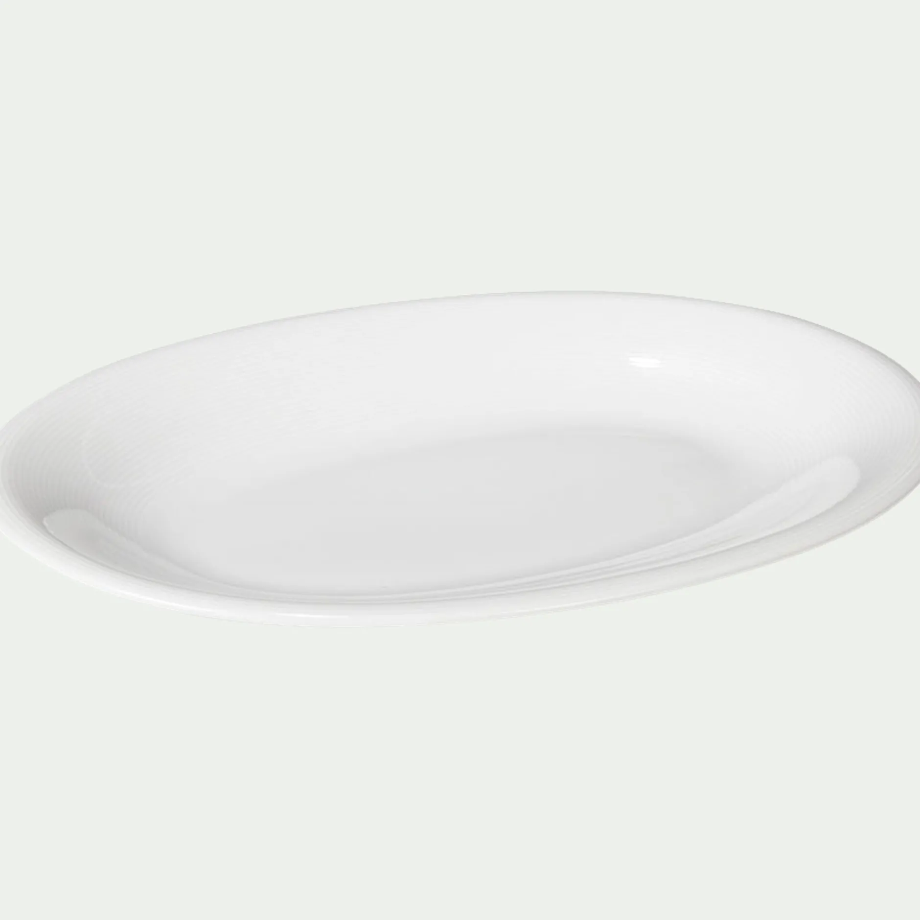 Une belle gamme de vaisselle de table qui se distingue par sa simplicité et par sa porcelaine de qualité hôtelière. Ce beau plat de présentation oval est orné de délicates rayures ton sur ton pour servir le repas à table avec raffinement.