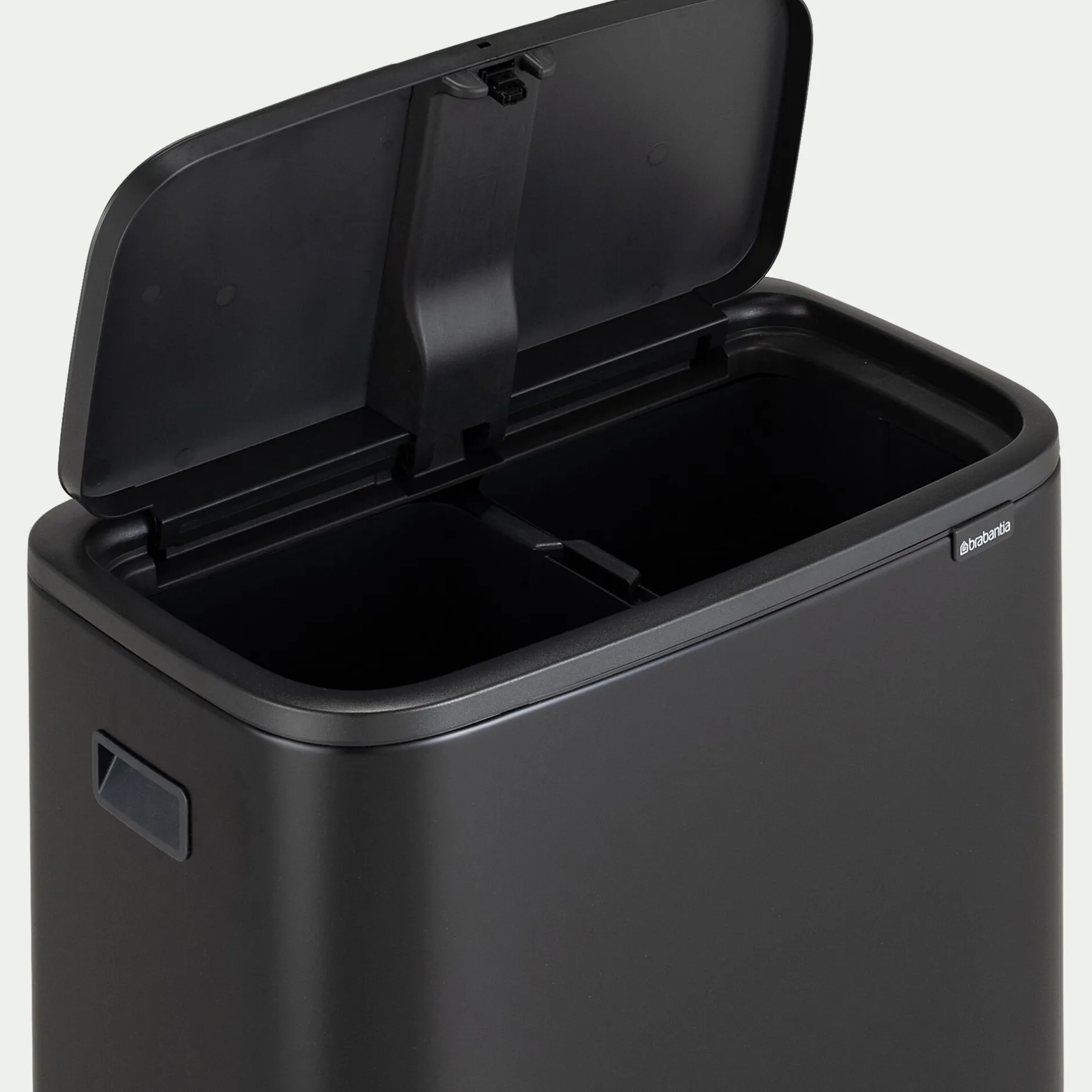 Cette poubelle XXL Brabantia Bo Touch 2×30 litres affiche un superbe design et possède tout ce dont vous avez besoin pour trier facilement vos déchets à la maison. Grâce à la présence de deux seaux amovibles d’une capacité de 30 litres chacun, vous avez la possibilité d’y jeter vos déchets selon leur nature. Cette grande poubelle noire en acier est dotée du système Soft Touch : il vous suffit d’effleurer le couvercle pour l’ouvrir. Un objet qui allie ici design et côté pratique afin de rendre votre quotidien plus agréable.