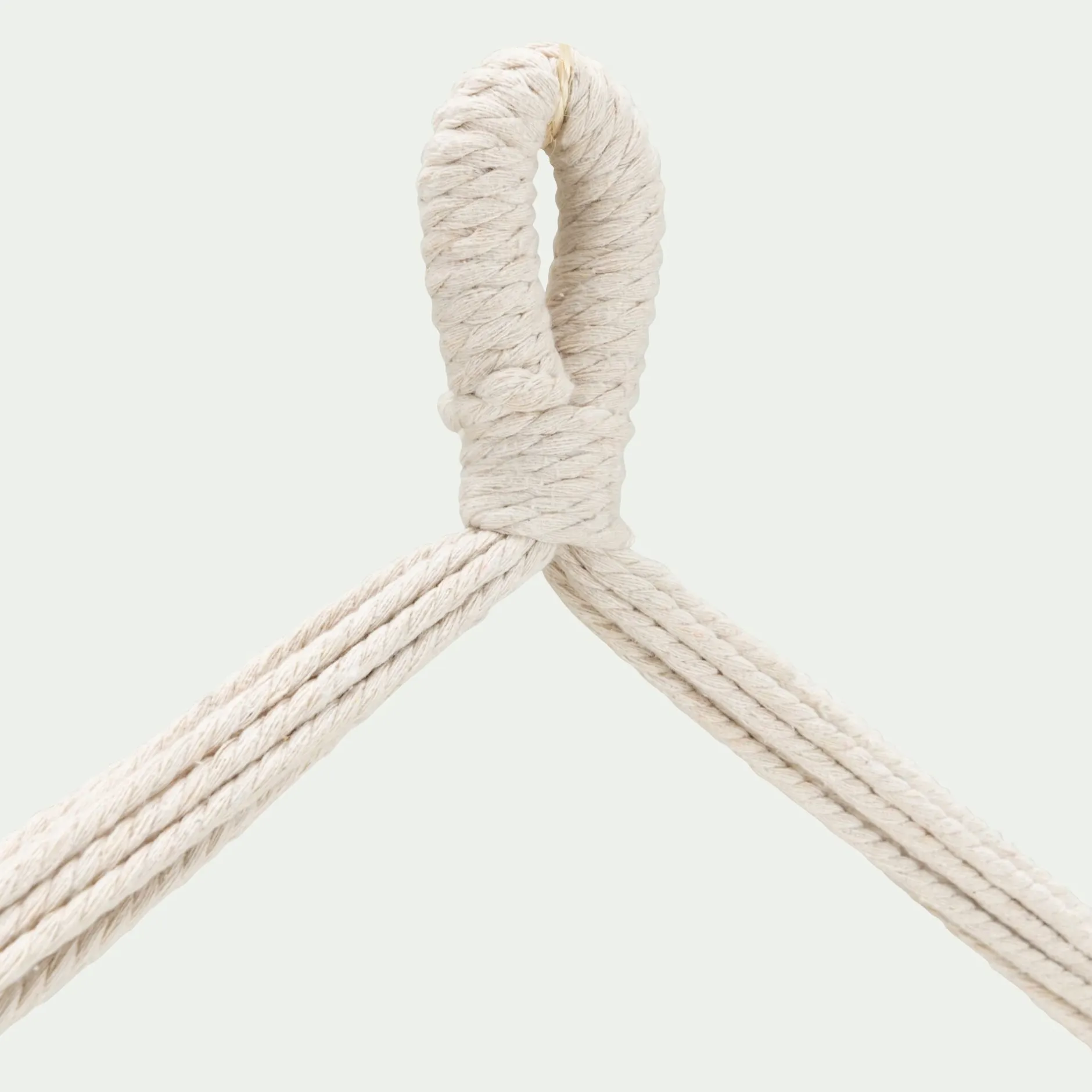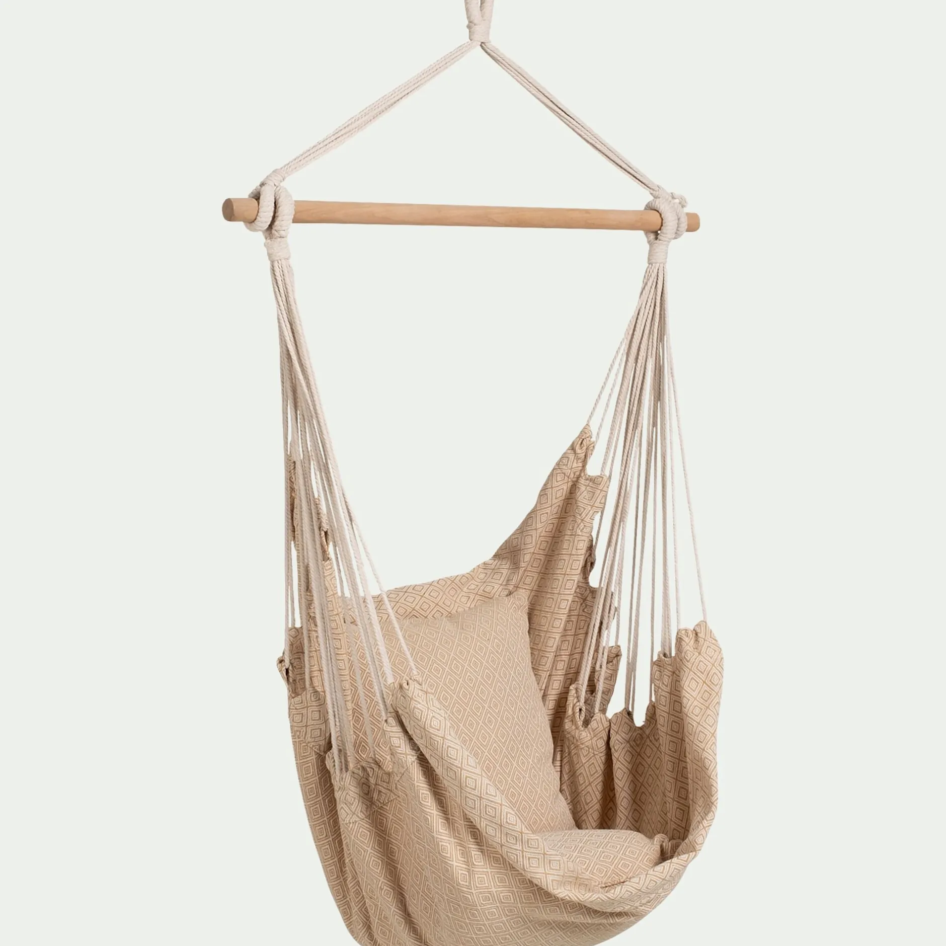 Offrez-vous une bulle de sérénité avec la chaise suspendue Cinto, parfaite pour le jardin. Accrochée grâce à un épais cordage robuste, elle garantit sécurité et stabilité. Ce fauteuil suspendu est pensé pour le confort, avec son assise généreuse et ses deux coussins moelleux qui invitent à la détente. Véritable cocon, cette chaise suspendue de jardin est idéale pour s’évader avec un bon livre ou simplement profiter d’un moment de calme. Le tissu arbore un motif géométrique raffiné : des losanges beiges, qui ajoutent une touche de douceur et d’élégance à votre espace extérieur.