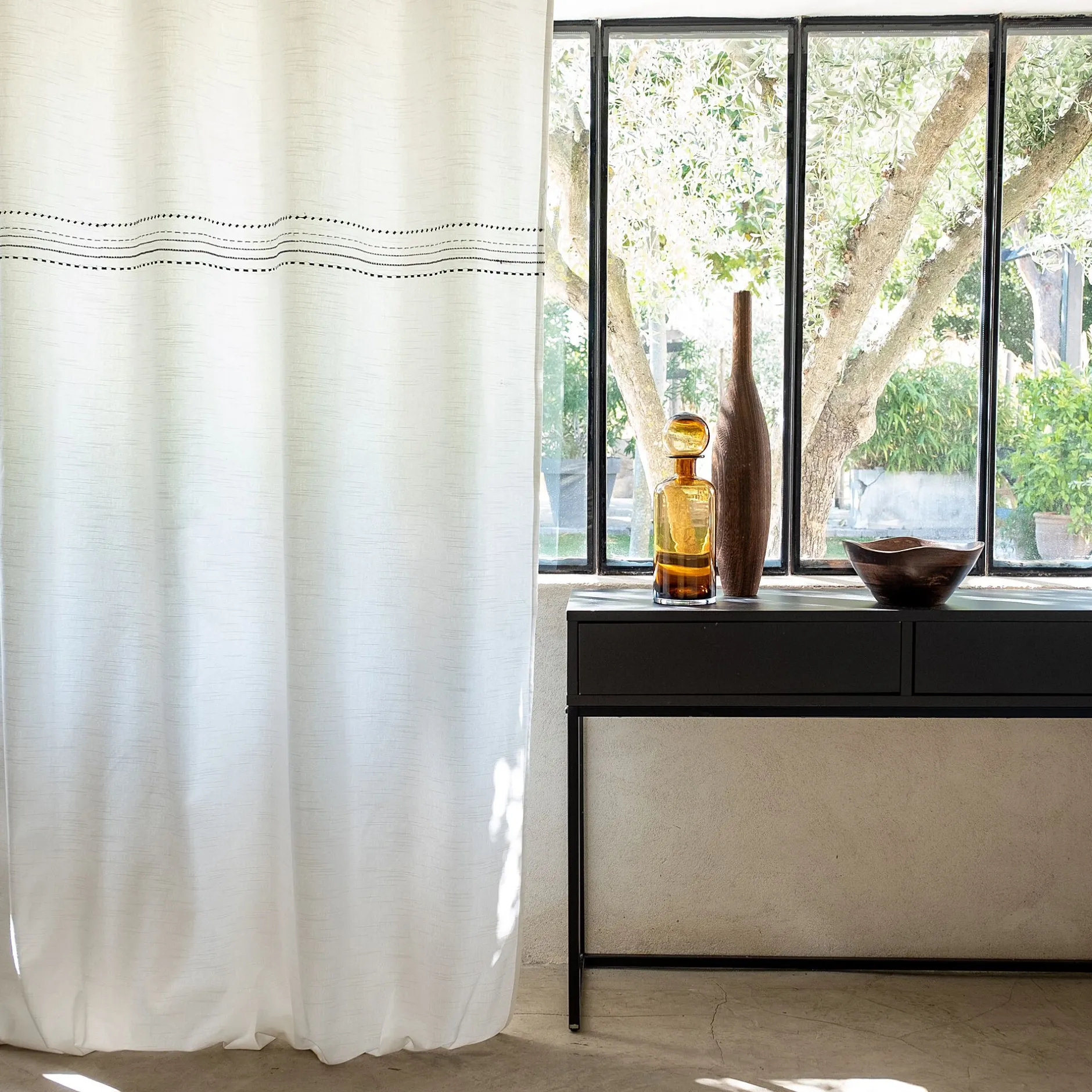 Medine est un rideau très élégant qui joue sur un léger contraste entre le noir et le blanc. Très lumineux, puisque majoritairement blanc, ce rideau doit son originalité à une succession de points de broderie divers. Ses oeillets lui permettent de coulisser facilement sur la tringle pour tamiser la pièce en mouvement. Plein de charme, ce rideau habille avec grâce l’espace et s’associe avec bon nombre de décorations.