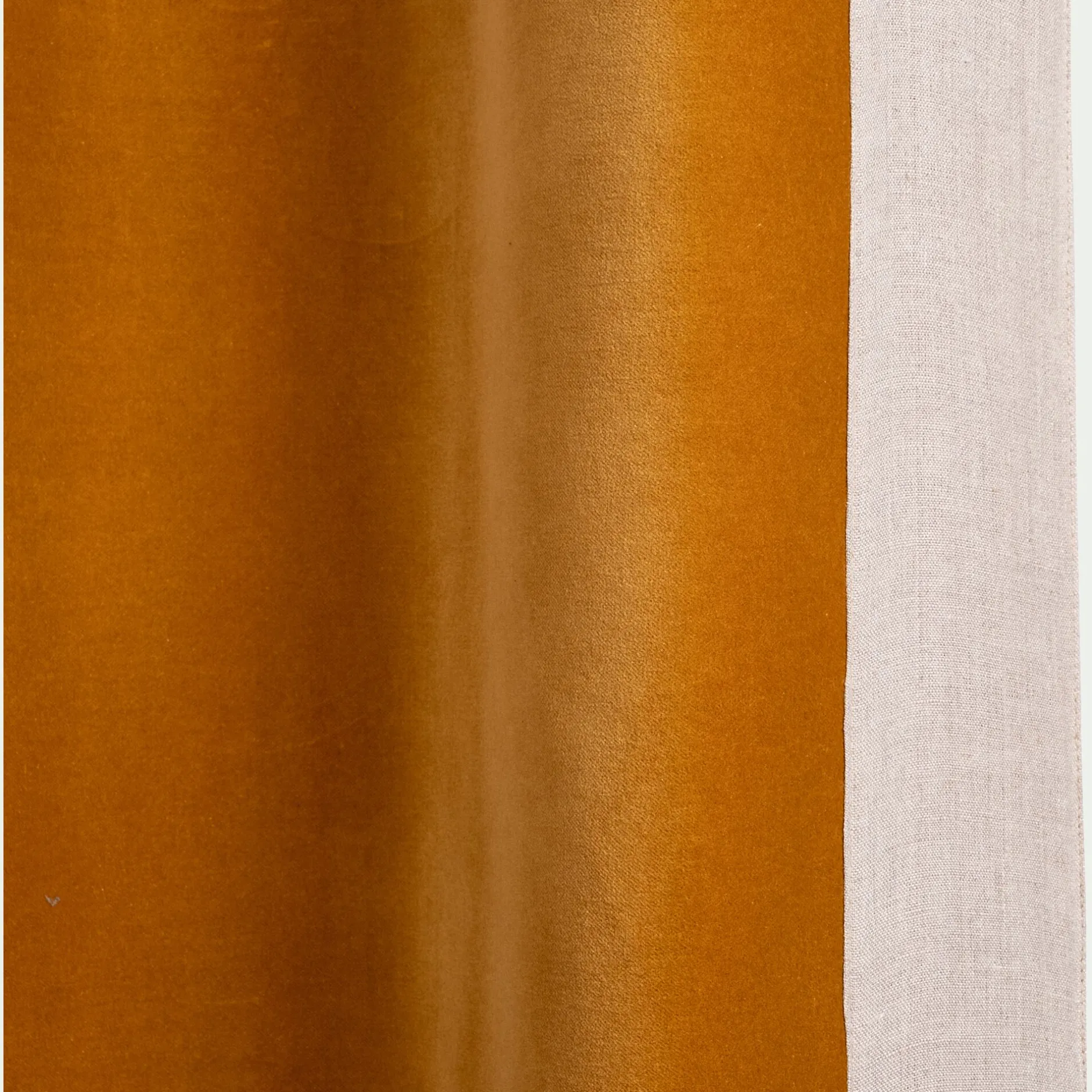 Le rideau Irene, confectionné en coton et lin, séduit par son aspect velours au toucher raffiné. Épais et légèrement brillant, il offre un tombé élégant tout en filtrant la lumière avec douceur. Uni et habillé d’un coloris jaune alep, solaire et précieux, il se présente au format 130×250 cm avec 8 œillets pour une installation facile et un rendu soigné.