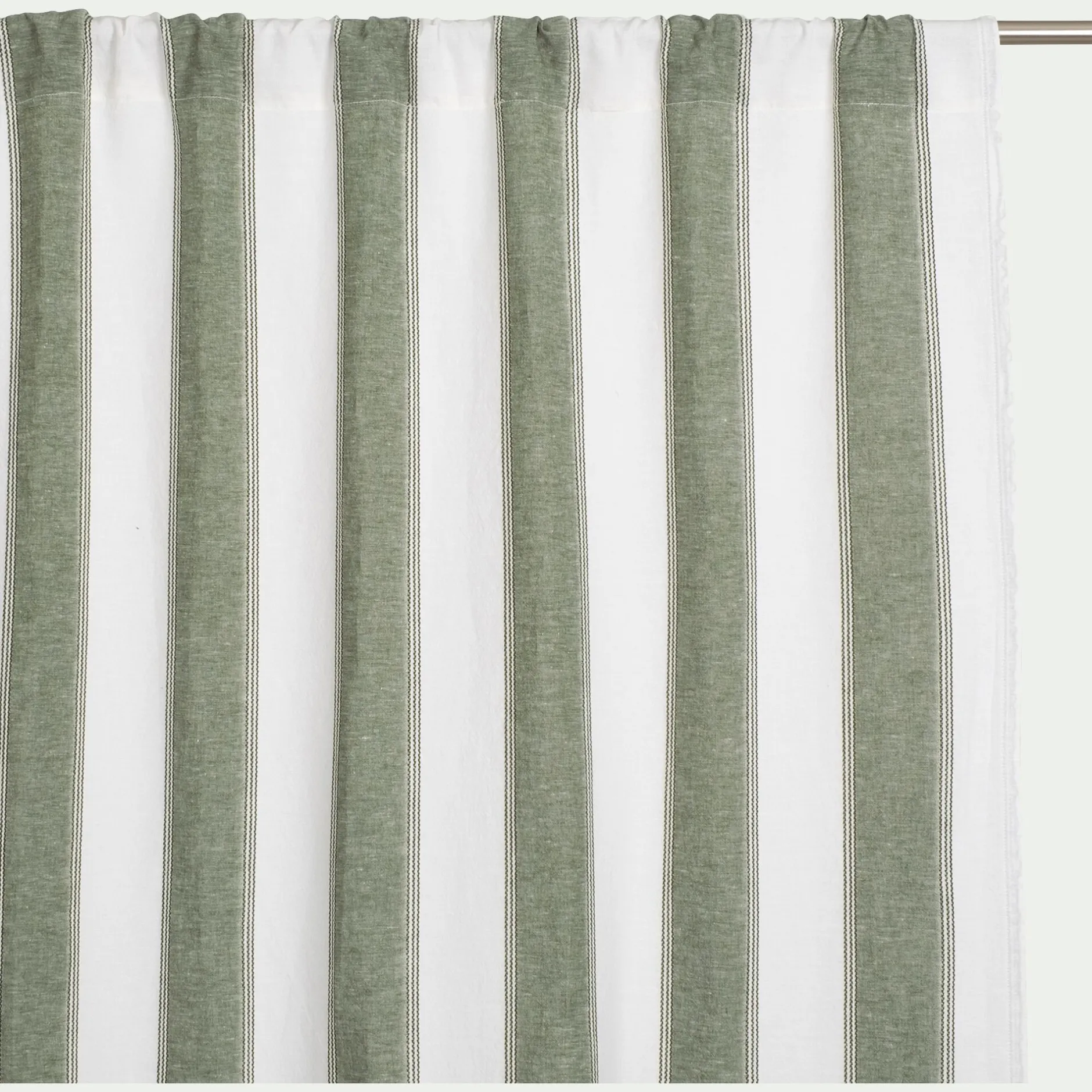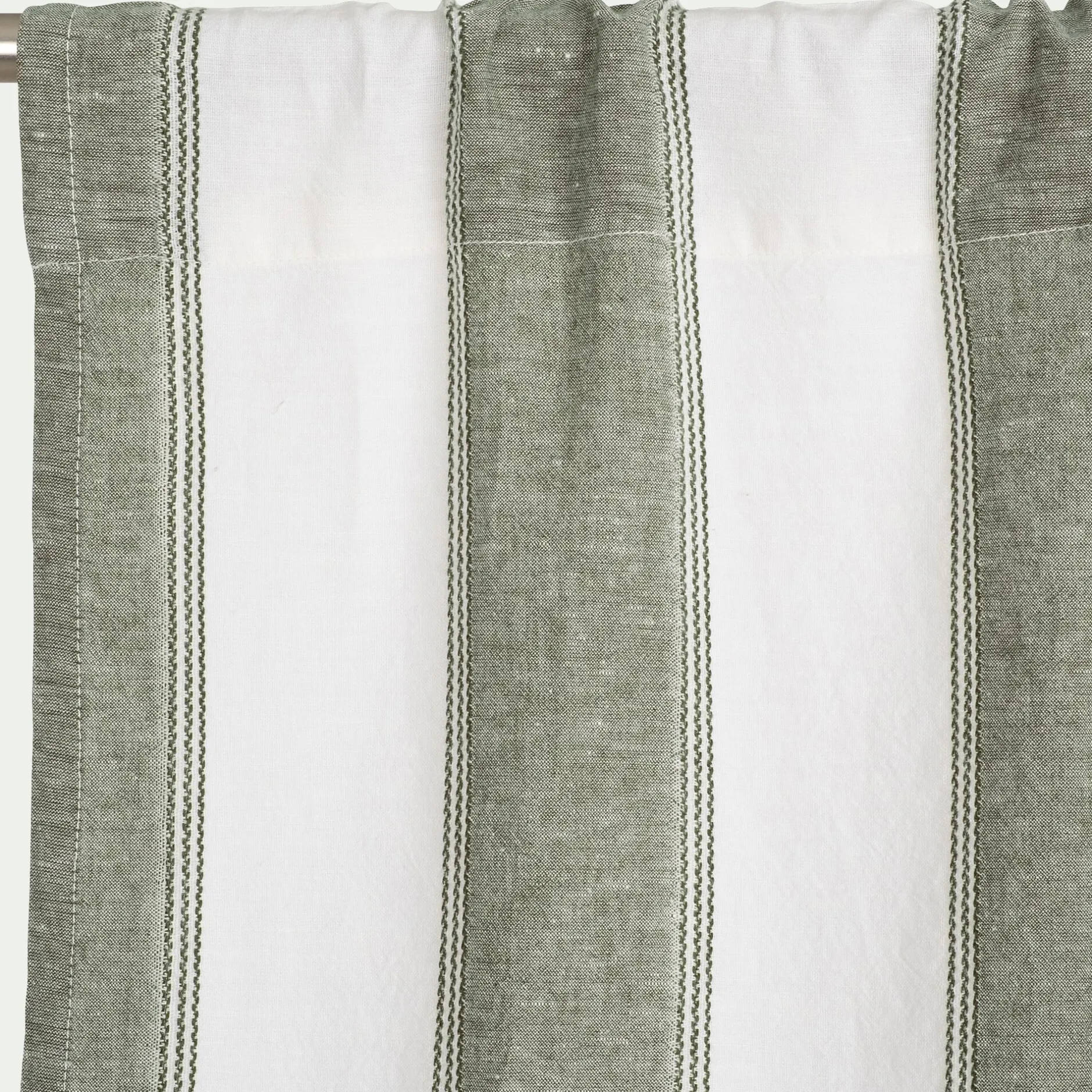 Apportez une touche déco en toute discrétion et délicatesse à votre intérieur avec ces rideaux à rayures vert et blanc. En lin et coton de haute qualité, ils sont confectionnés avec soin au Portugal et témoignent d’un savoir-faire. Ils vous permettront de sublimer votre maison avec charme et authenticité. En 140×250 cm, leur tissu laisse passer la lumière tout en préservant votre intimité pour une ambiance tamisée. Ces rideaux sont le mariage entre élégance et durabilité. Leur matière naturelle et leur doux coloris créent une atmosphère lumineuse et apaisante dans votre pièce. Idéaux pour habiller vos fenêtres avec subtilité, ils s’adapteront à une déco naturelle ou moderne.
