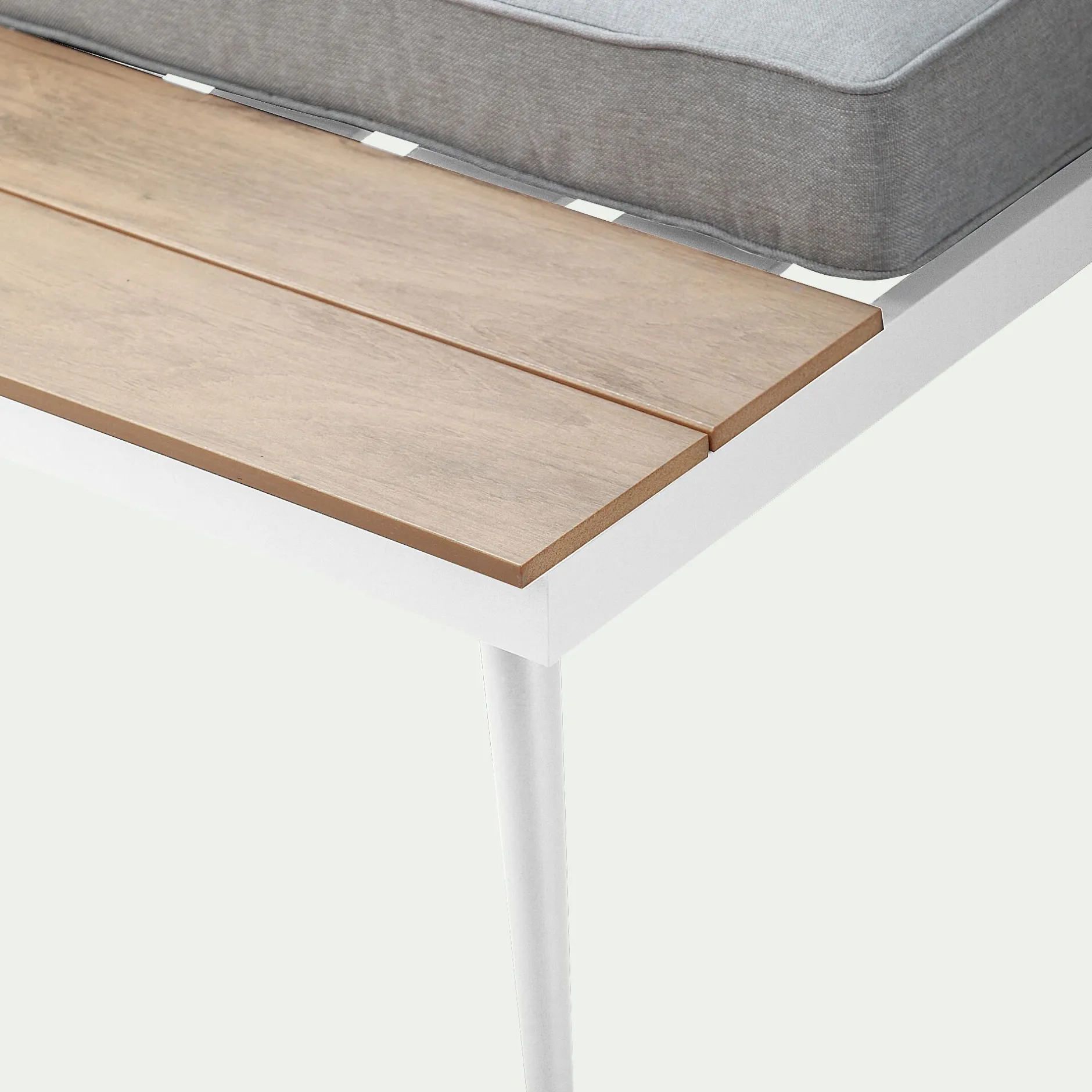 Structure en aluminium finition époxy avec latte en polywood au niveau assise et plateau de table basse.