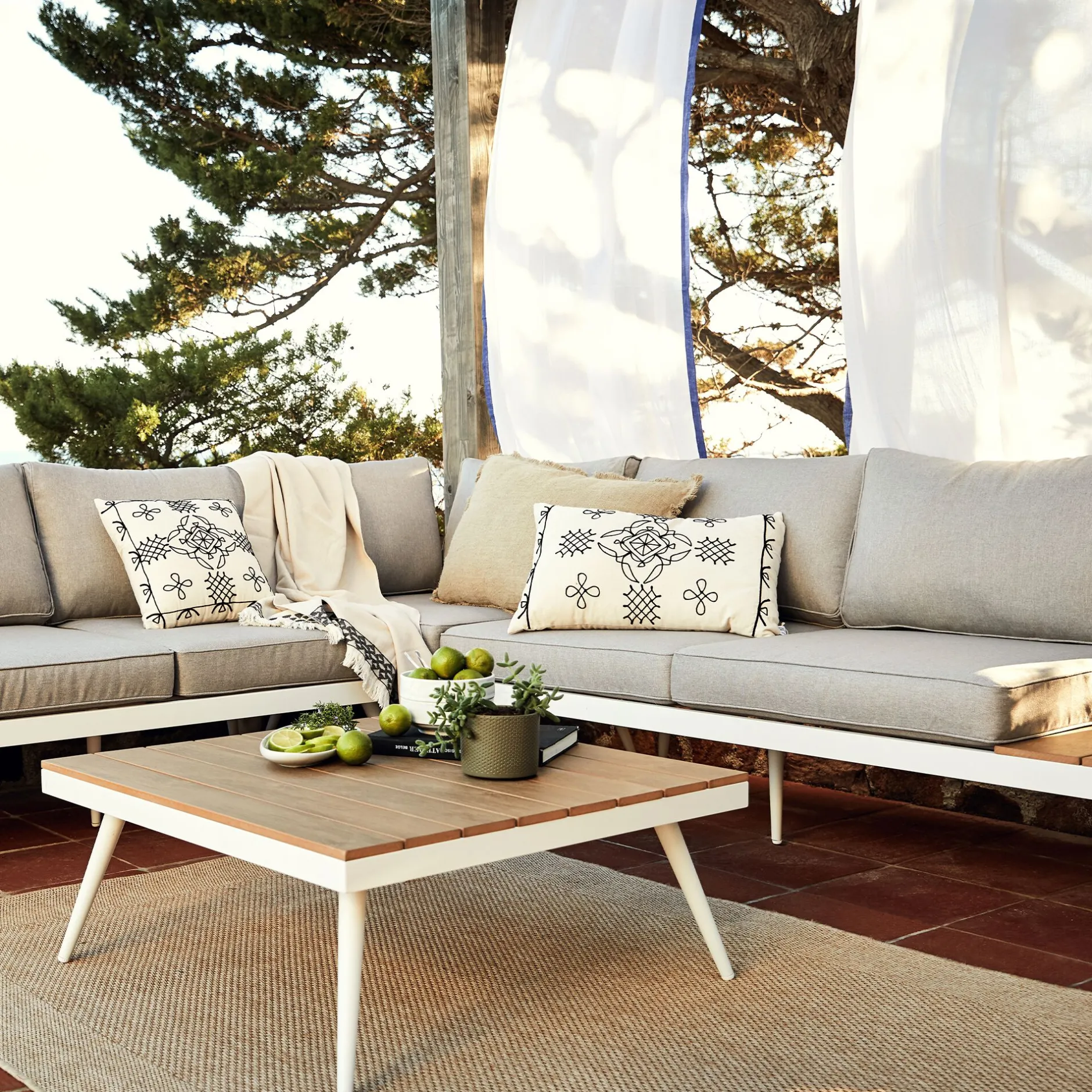 - Coussins avec housse en tissu déperlant et traité anti-UV.